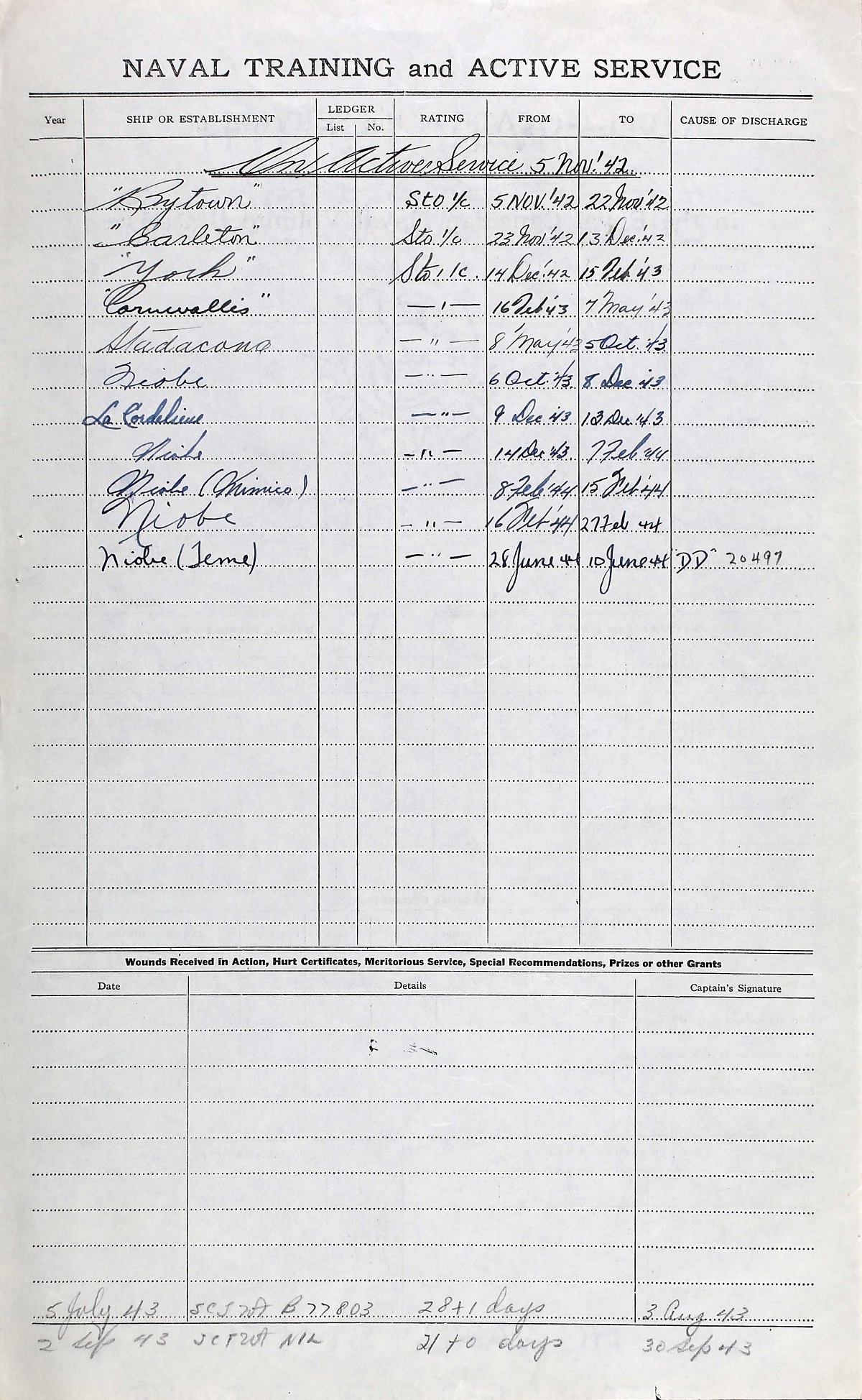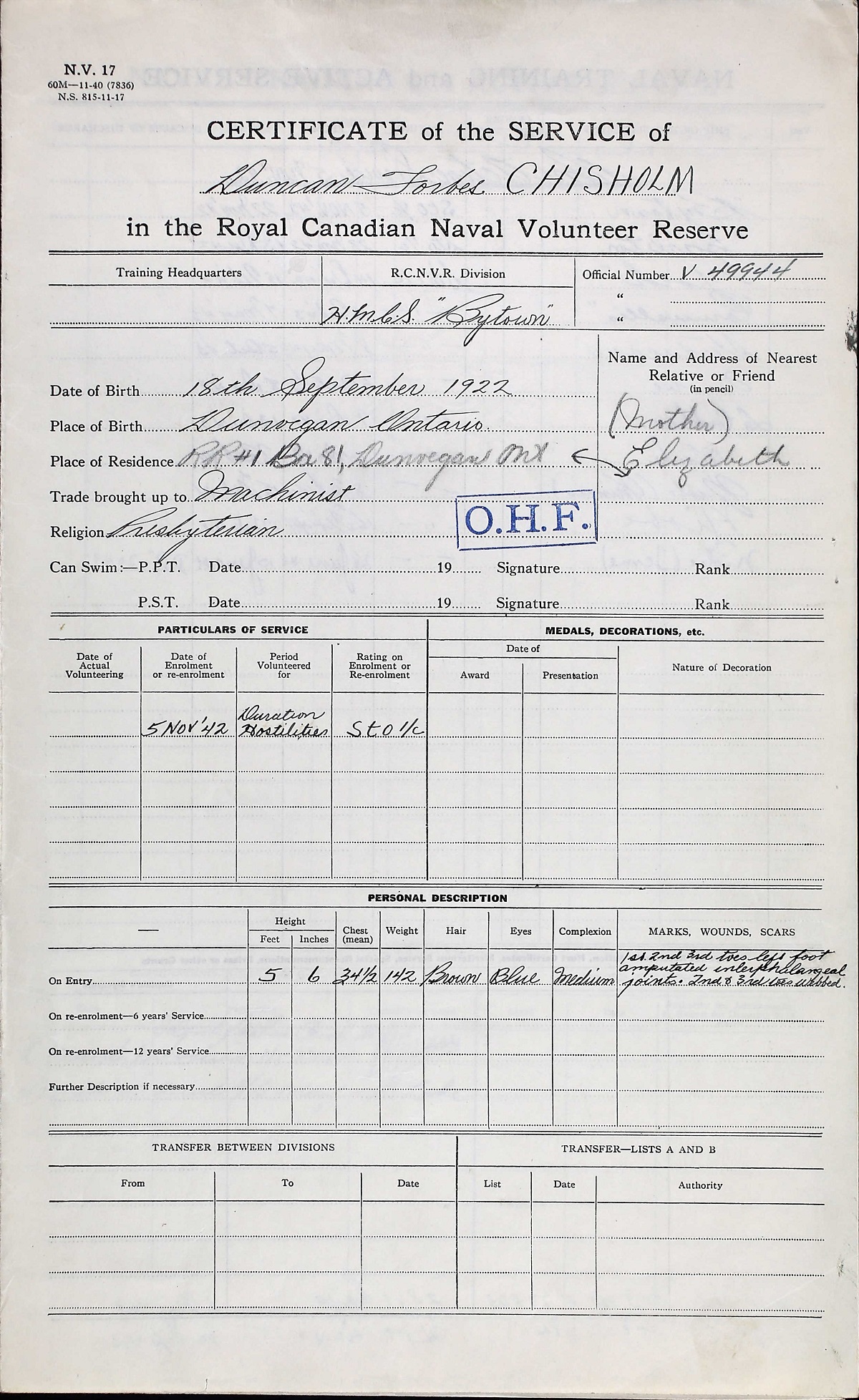 HMCS BYTOWN - Enlisted and commenced Active Service 05 Nov 1942