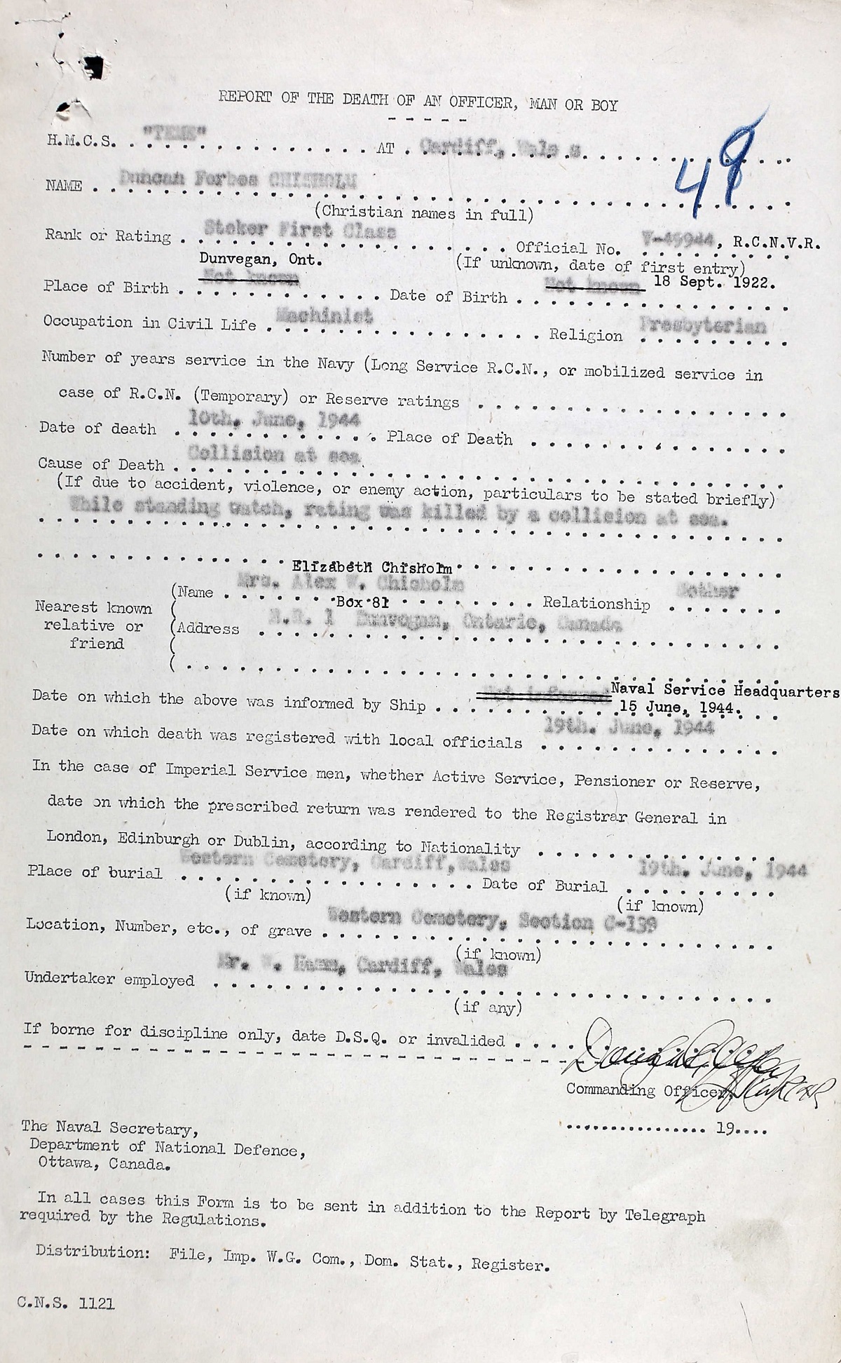 Stoker 1st Class D. F. Chisholm, died in United States Hospital at Creevagh, Londonderry, Northern Ireland as the result of the collision between HMCS TEME and HMS TRACKER on June 10, 1944. He is buried in the Western Cemetery, Cardiff, Glamorganshire, Wales.