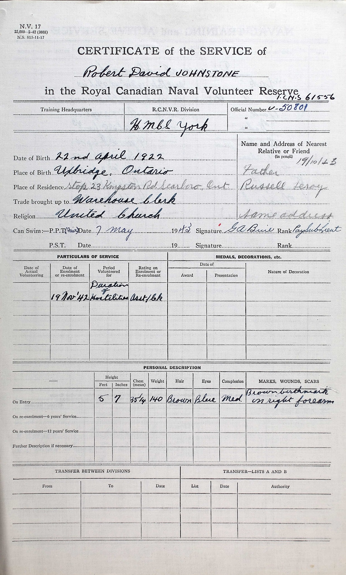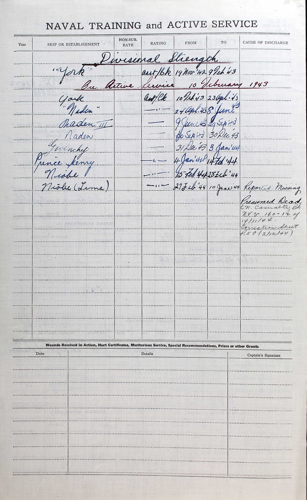 Ships served in: HMCS YORK - Enlisted 19 Nov 1942. Commenced Active Service 10 Feb 1943 HMCS GIVENCHY (Depot Ship) - Records in the books of GIVENCHY 31 Dec 1943 - 03 Jan 1944 HMCS PRINCE HENRY - Served in PRINCE HENRY 04 Jan 1944 - 14 Feb 1944 as an Asst. Cook, RCNVR HMCS TEME - Drafted to TEME 24 Feb 1944 as an Asst. Cook, RCNVR