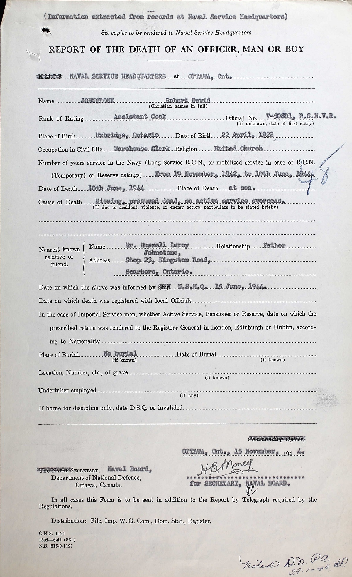 JOHNSTONE, Robert David, Asst. Cook, V50801, RCNVR, MPK - 10 Jun 1944, HMCS TEME - Son of Russell Leroy Johnstone and Dora Alice Johnstone, of Scarboro, Ontario.