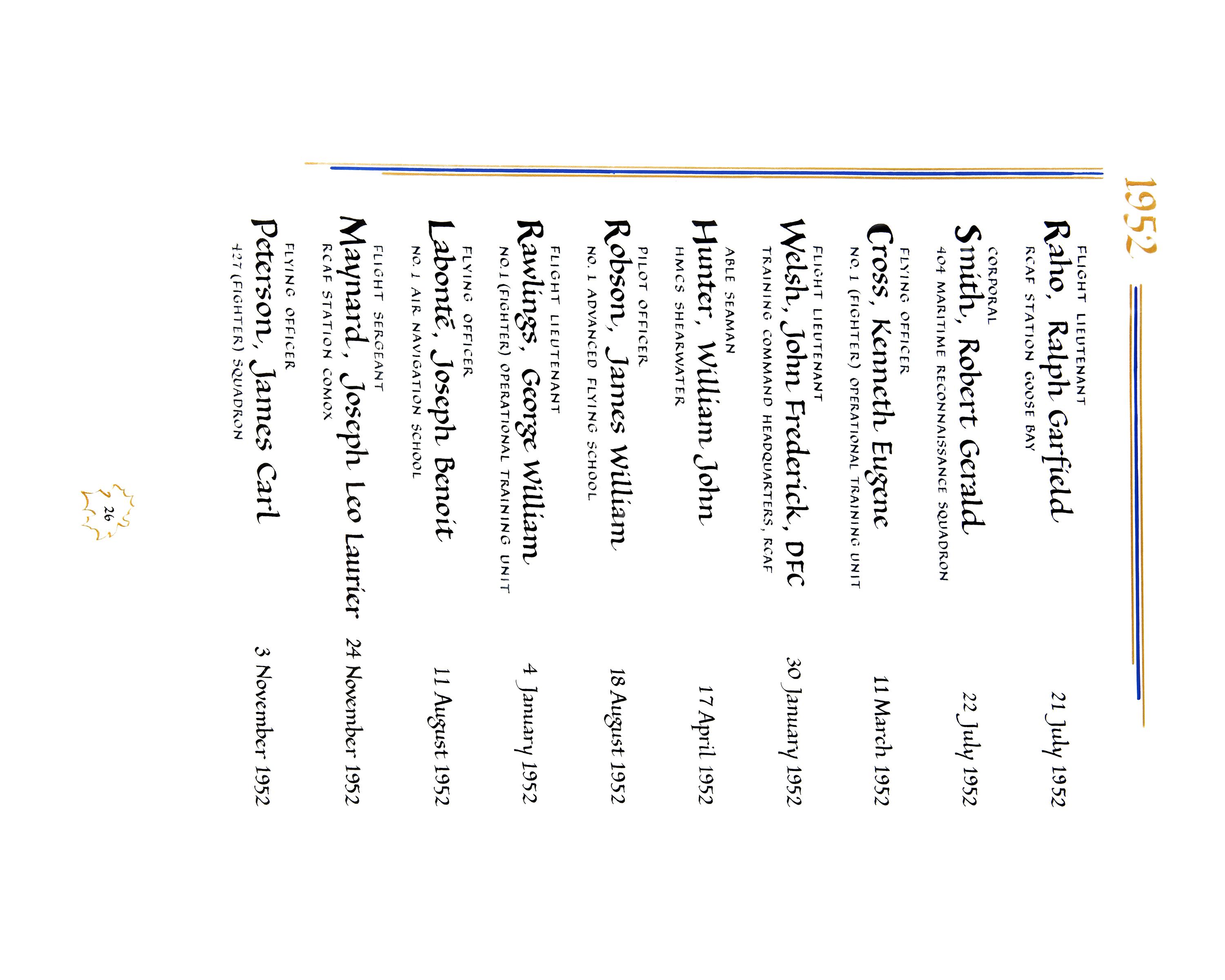 HUNTER, William John Demy, AB, 11216, RCN, MPK - 17 Apr 1952, HMCS SHEARWATER - Son of Joseph and Withelmine of Dunsford, Ontario. Husband of Donna (nee Rishel) Hunter. Father of Katheryn Hunter. Brother of Earl, Frederick, James and Josephine Hunter.