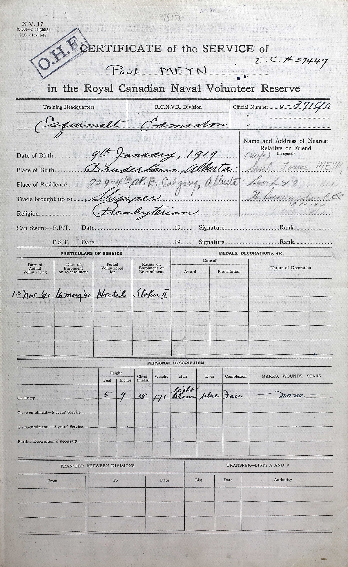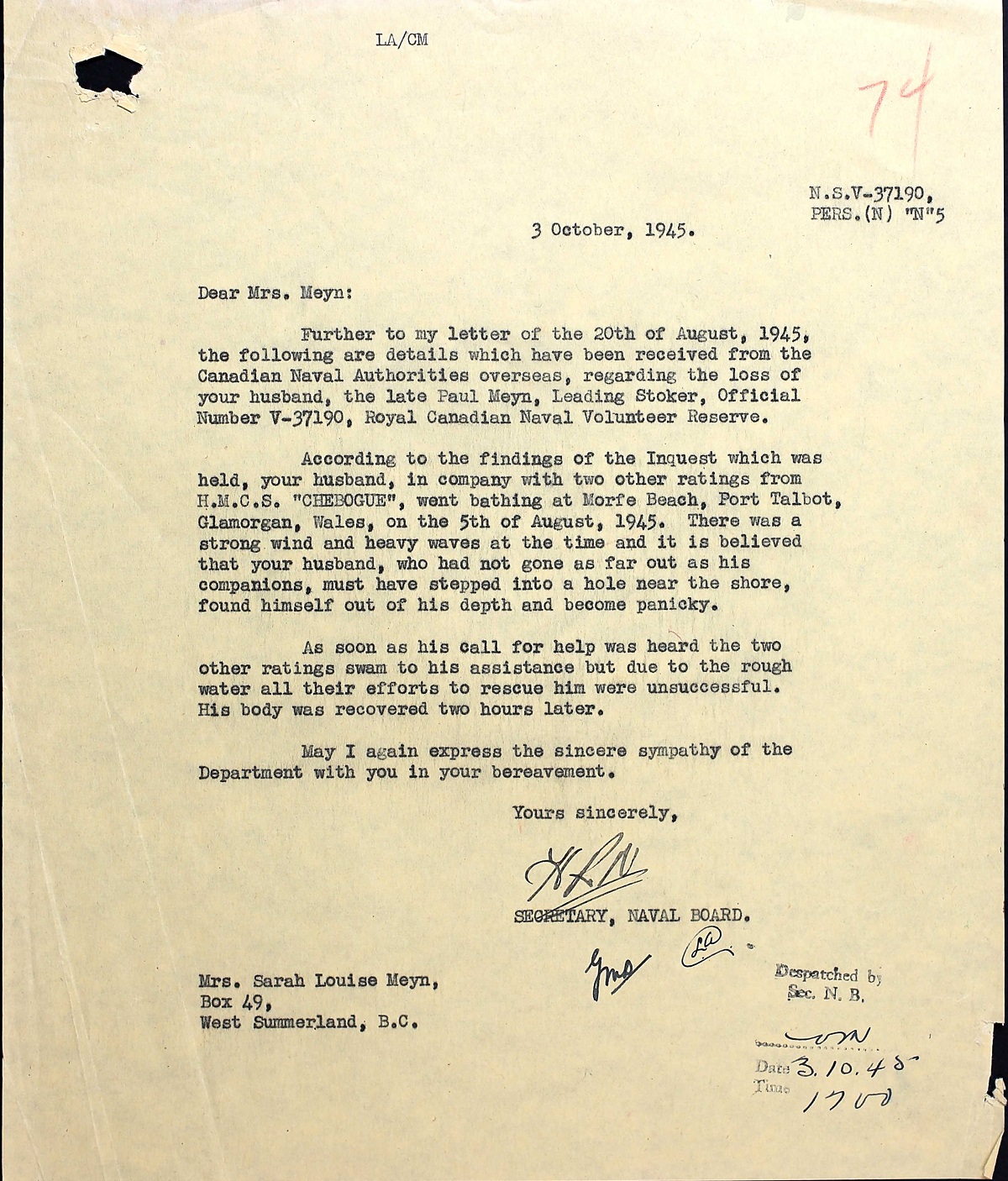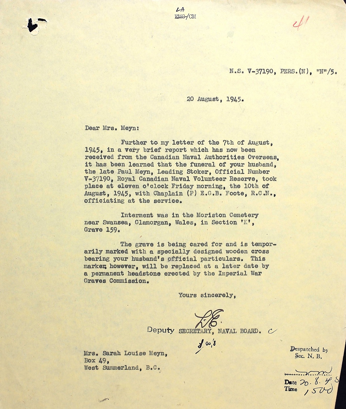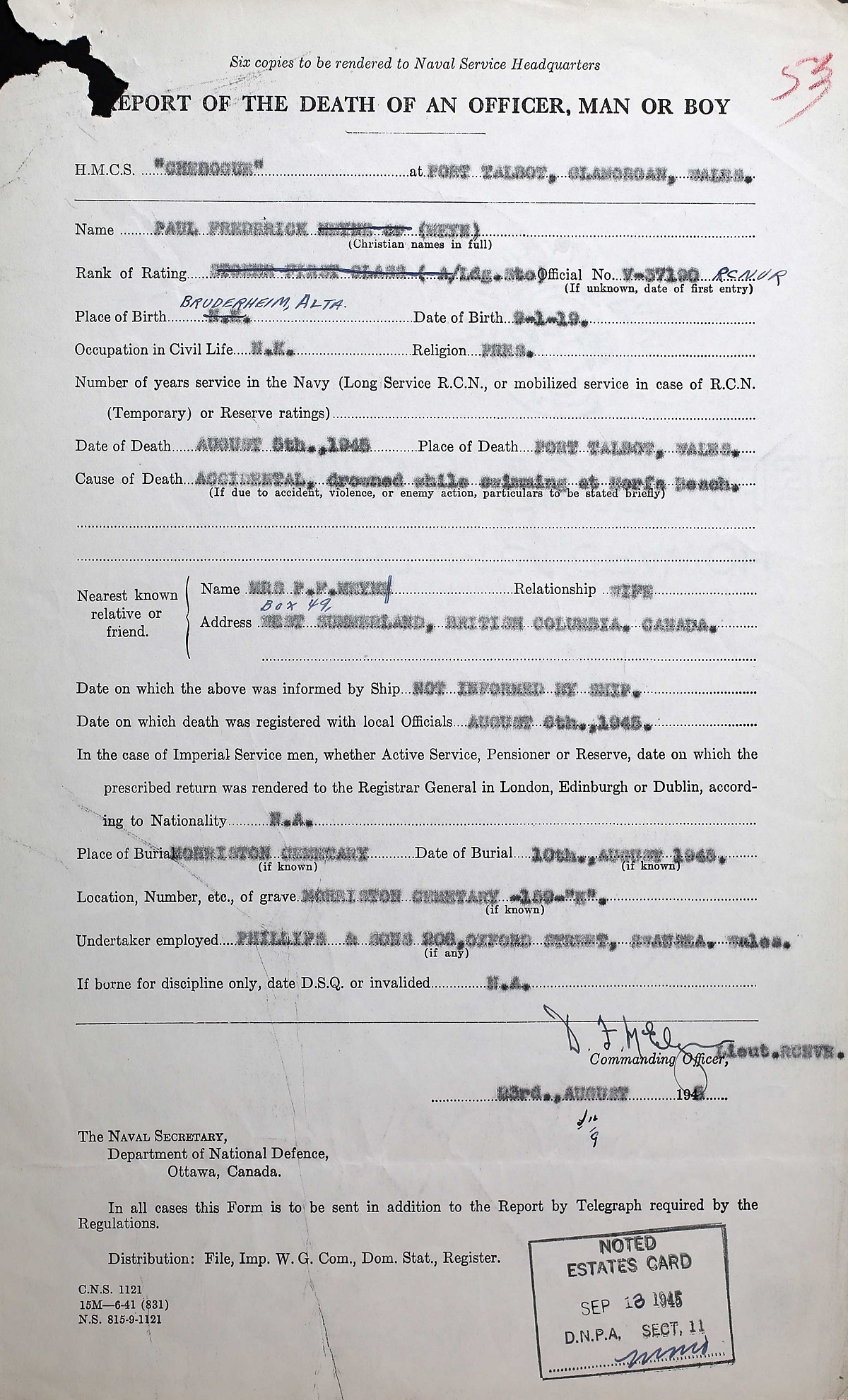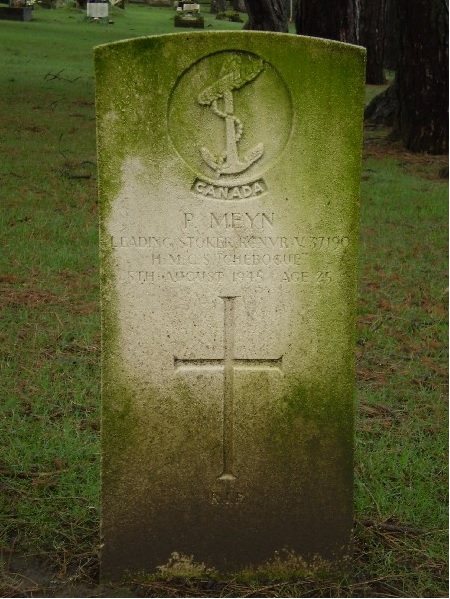 MEYN, Paul Frederick, L/Sto, V37190, RCNVR, died - 05 Aug 1945, HMCS CHEBOGUE - Son of Hilda Meyn; husband of Sarah Louise Meyn, of West Summerland, British Columbia.