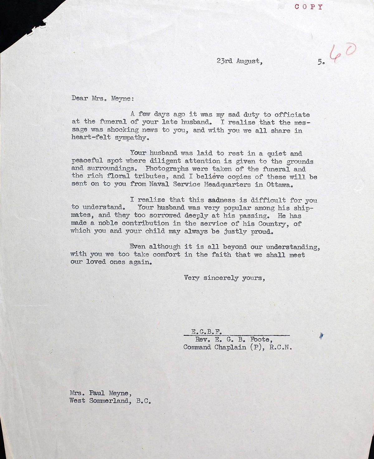(PM06-PM09) Letter to L/Sto Meyn's wife on his Naval Funeral with photos