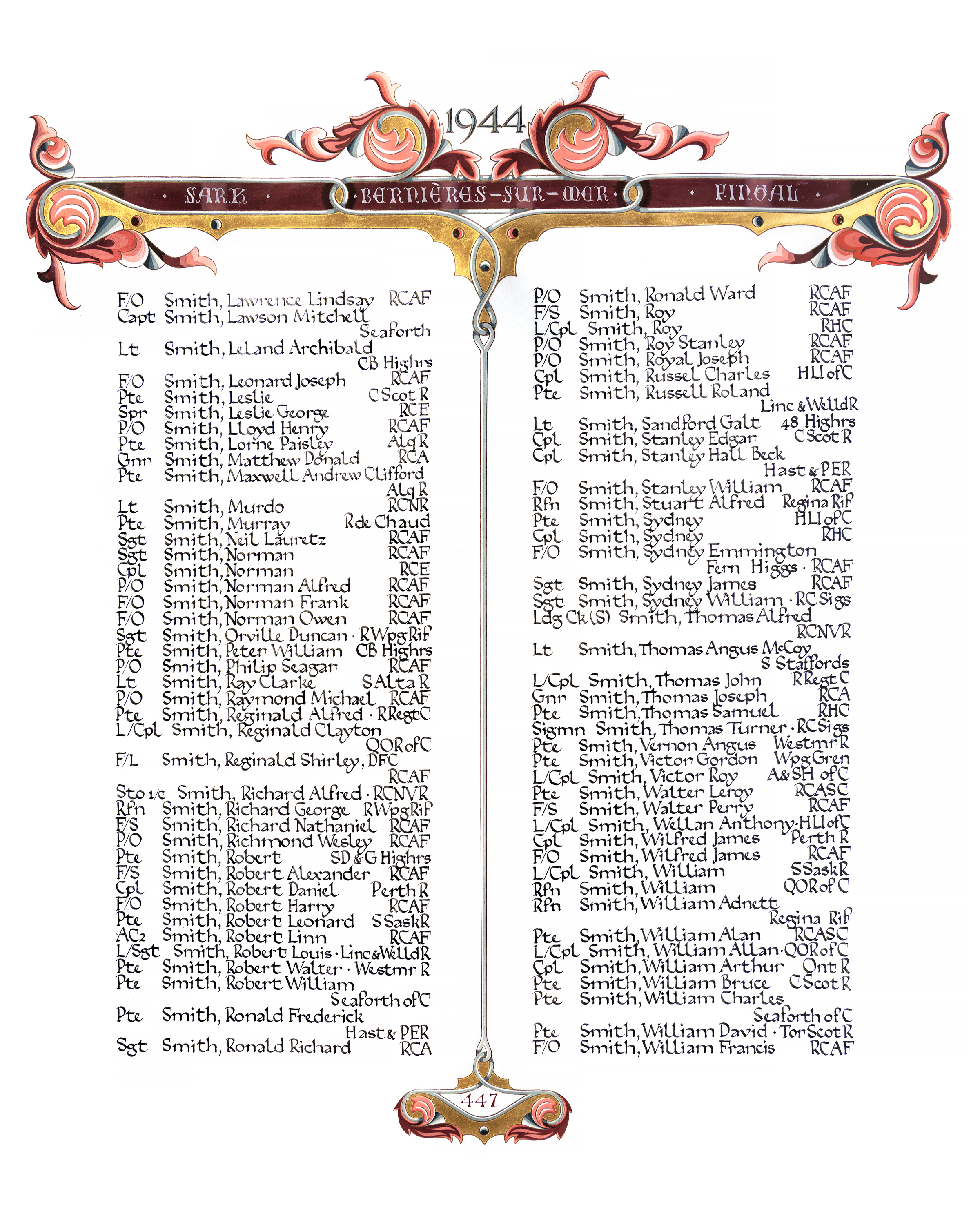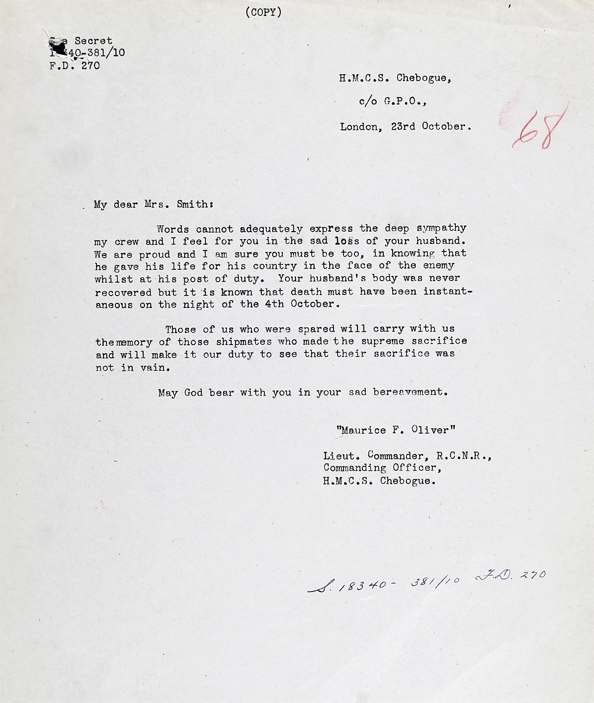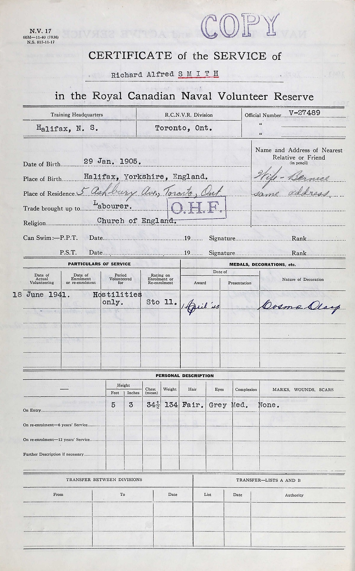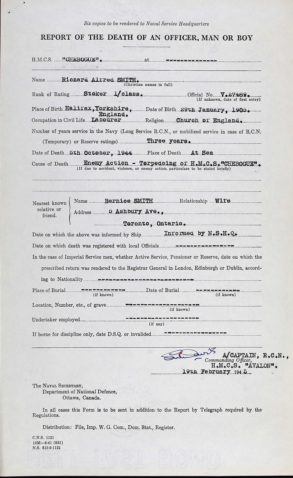 Stoker 1st Class Richard Alfred Smith, 39, only child of Mrs. Janet McKinnon of 14 Hope St., and the late Alfred Smith of Halifax, Yorkshire, is reported killed as a result of enemy action. In a casualty list issued by the Navy at Ottawa yesterday, Stoker Smith enlisted in the R.C.N.V.R. in October, 1941, and went to sea for the first time the following spring. Before he enlisted in the navy he had 13 years in the Non-Permanent Militia, being a member of several regiments. Stoker Smith was born in Halifax, Yorkshire, and went to school there, coming to Canada at the age of 15 with his mother. His wife, the former Bernice Witty of Montréal, lives at 5 Ashbury Ave., with their two children, Irene, 11, and Richard, 9.