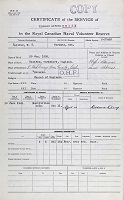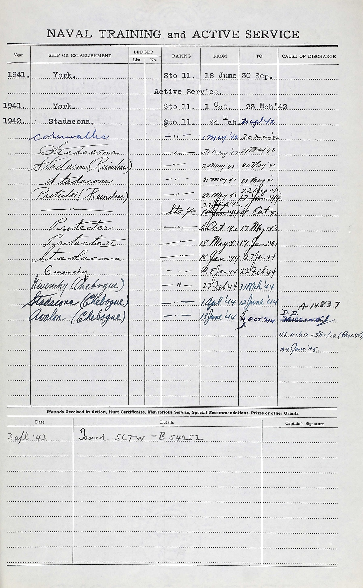 Ships served in: TORONTO DIVISION RCNVR - Enlisted 18 Jun 1941. Commenced Active Service 01 Oct 1941 HMCS REINDEER- Served in REINDEER 22 May 1942 - 04 Oct 1942 as a Sto 2c and Sto 1c, RCNVR. Rated Sto 1c 23 Sep 1942 HMCS CHEBOGUE - Drafted to CHEBOGUE 23 Feb 1944 as a Sto 1c, RCNVR