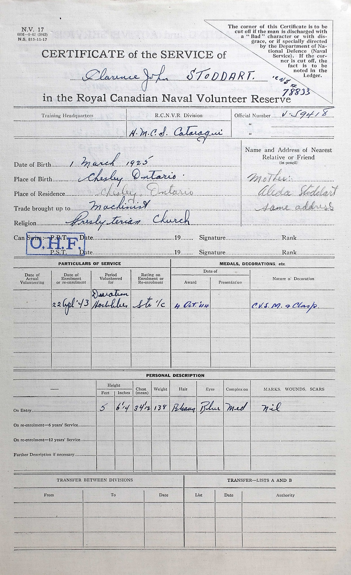 Ships served in: HMCS CATARAQUI - Enlisted 22 Apr 1943. Commenced Active Service 05 May 1943 HMCS CHEBOGUE - Drafted to CHEBOGUE 23 Feb 1944 as a Sto 1c, RCNVR