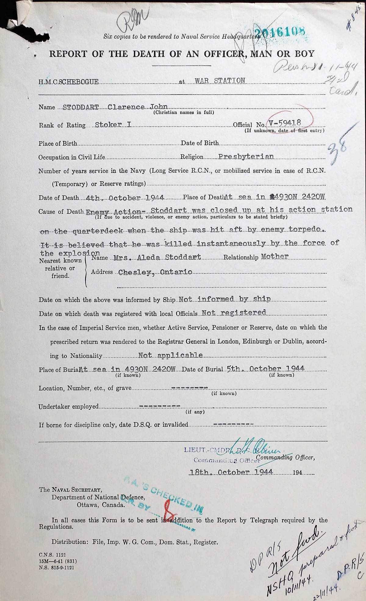 STODDART, Clarence John, Sto 1c, V59418, RCNVR, MPK - 04 Oct 1944, HMCS CHEBOGUE - Son of Walter and Aleda Stoddart, of Chesley, Ontario.