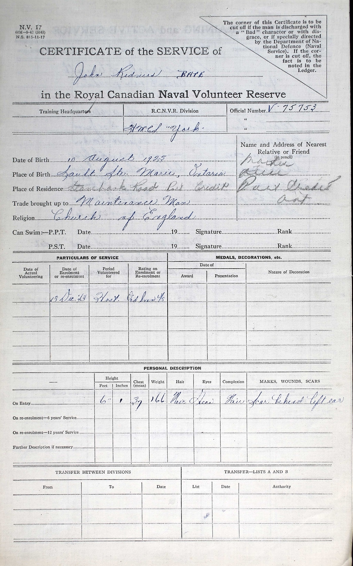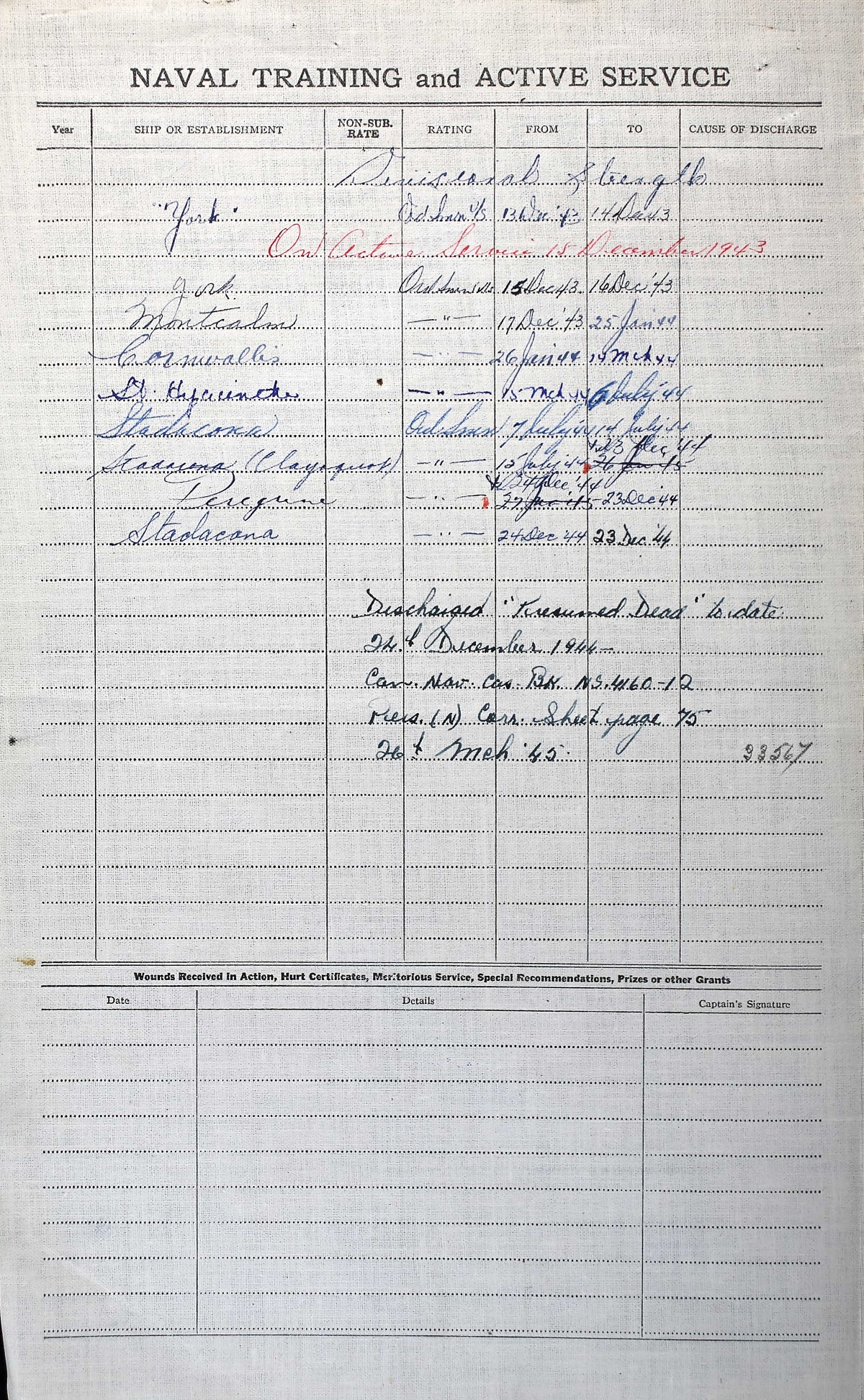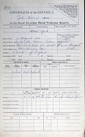 Ships served in: HMCS YORK - Enlisted 13 Dec 1943. Commenced Active Service 15 Dec 1943 HMCS MONTCALM - Served in MONTCALM 17 Dec 1943 - 25 Jan 1944 as an OS, RCNVR HMCS CLAYOQUOT - Drafted to CLAYOQUOT - 15 July 1944 as an OS, RCNVR