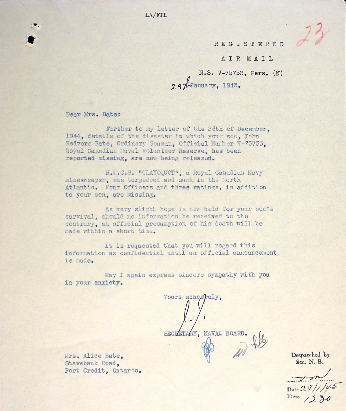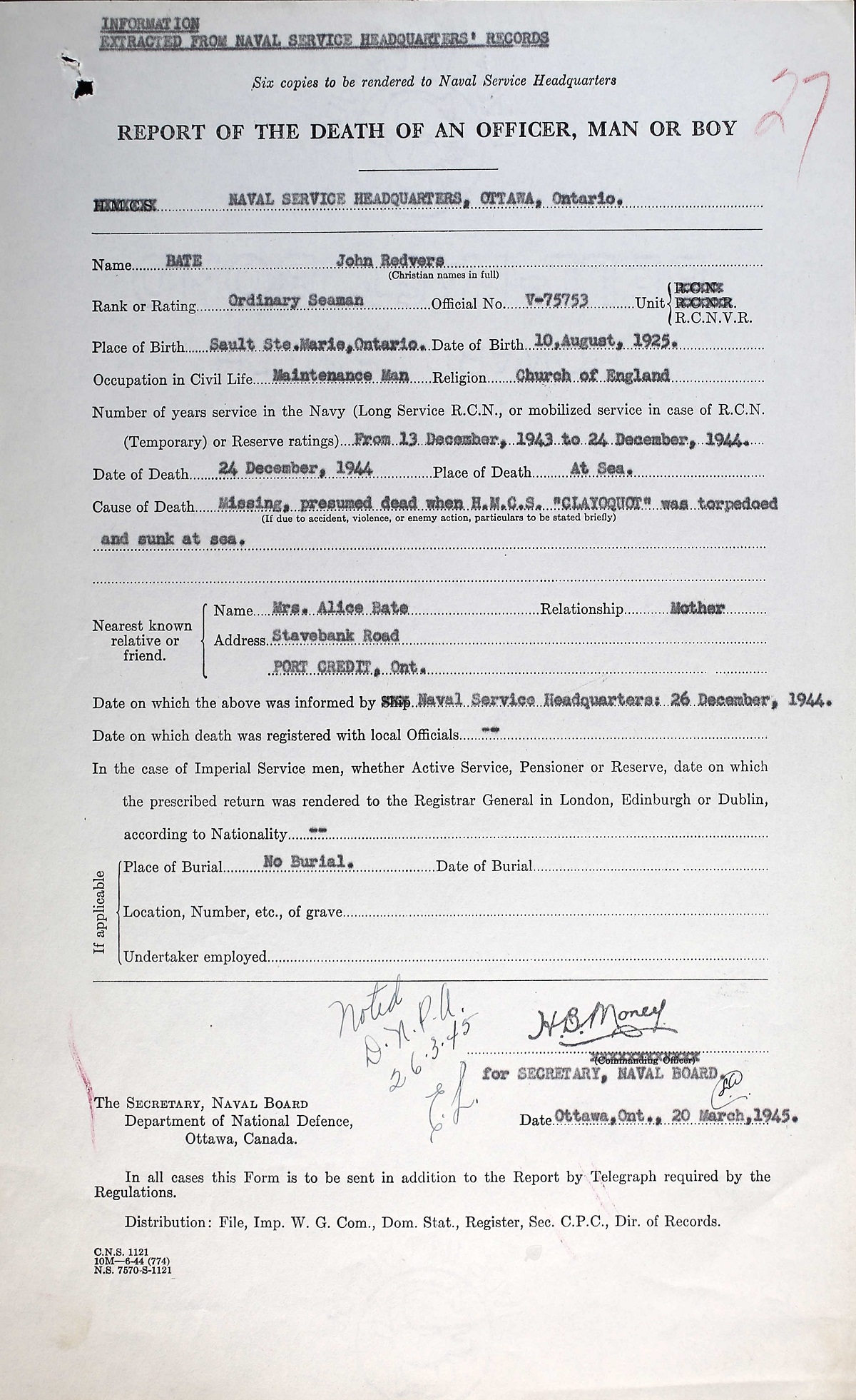 Ordinary Seaman J. R. Bate, 19, is now reported dead according to word reaching his parents, Mr. and Mrs. Redvers H. Bate, Stavebank Road, Port Credit, Ontario. He had been reported missing Jan. 31, 1944, when his boat, HMCS CLAYOQUOT, a Minesweeper of the Bangor Class, was sunk by enemy action in the North Atlantic. He was a former Sea Scout with the 1st Port Credit Troop, and before enlisting with the navy at Toronto, Served with the Lorne Scots Reserve Regiment for eight months. He was born in Sault Ste. Marie and had Attended Brown School and Port Credit high school.
