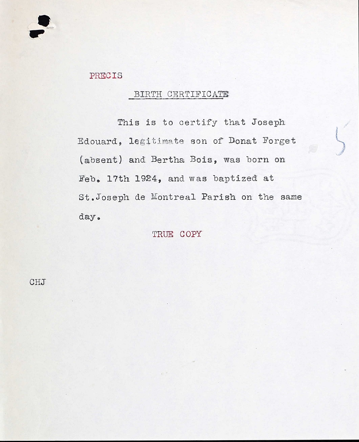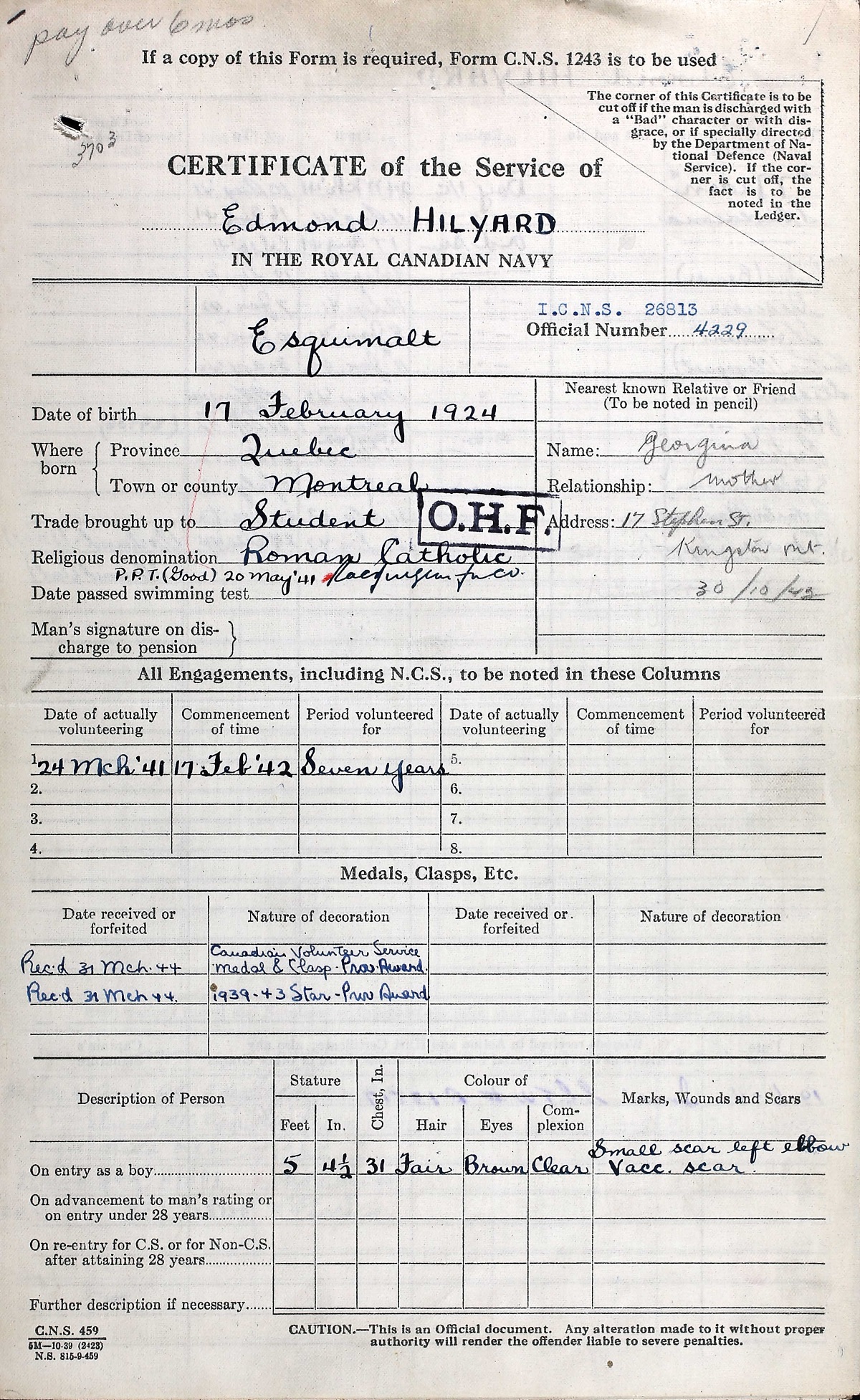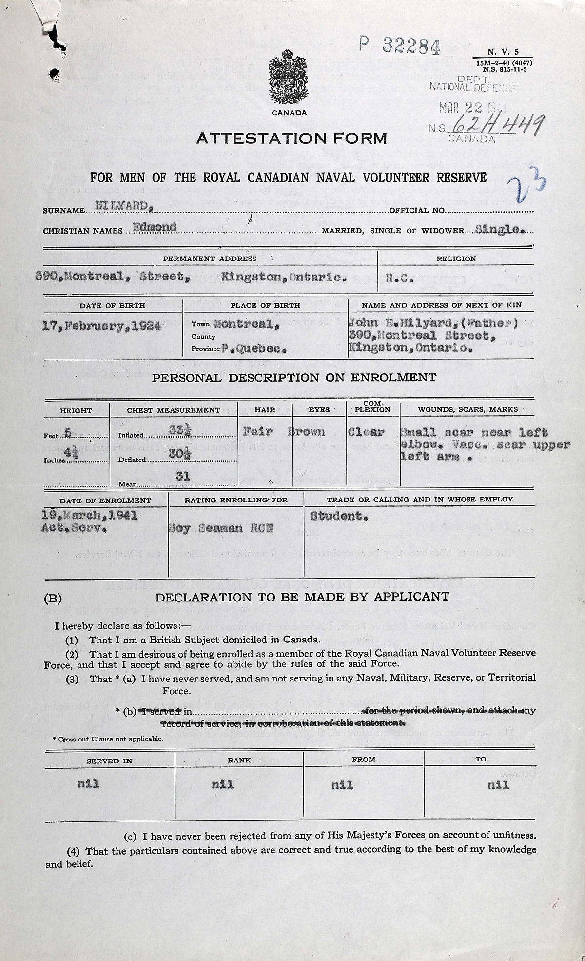 HILYARD, Edmond, AB A/AA3, 4229, RCN, MPK - 24 Dec 1944, HMCS CLAYOQUOT - Son of John E. and Georgina Hilyard, of Kingston, Ontario. Edmond Hilyard was born Joseph Edouard Forget, son of Donat Forget and Bertha Bois. He was adopted by John and Georgina Hilyard at the age of 19 days.