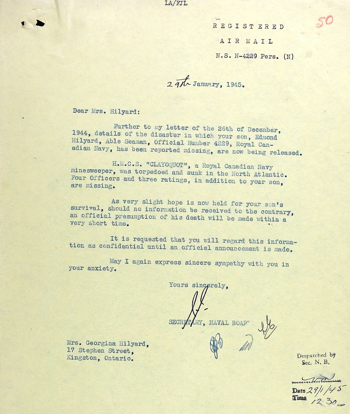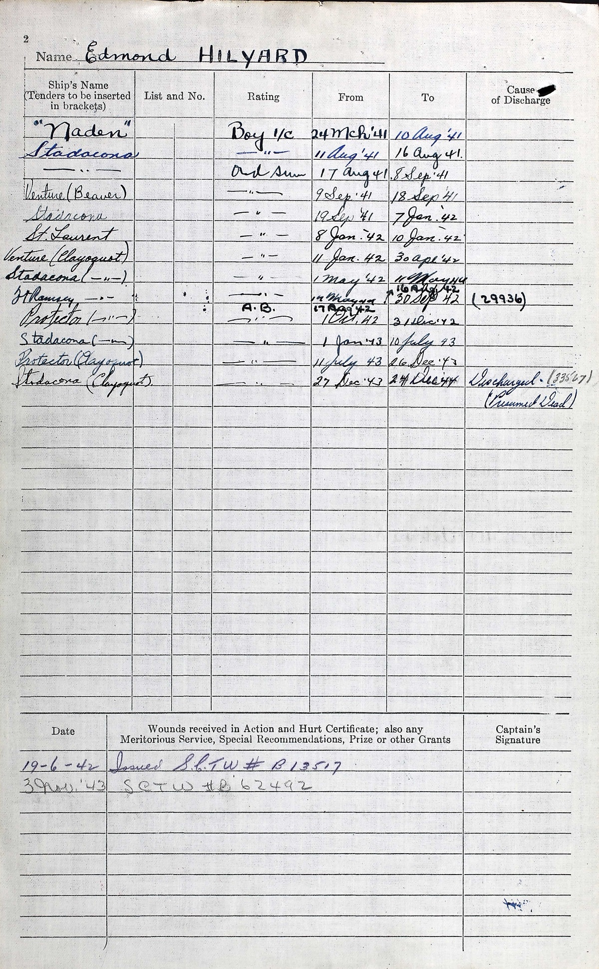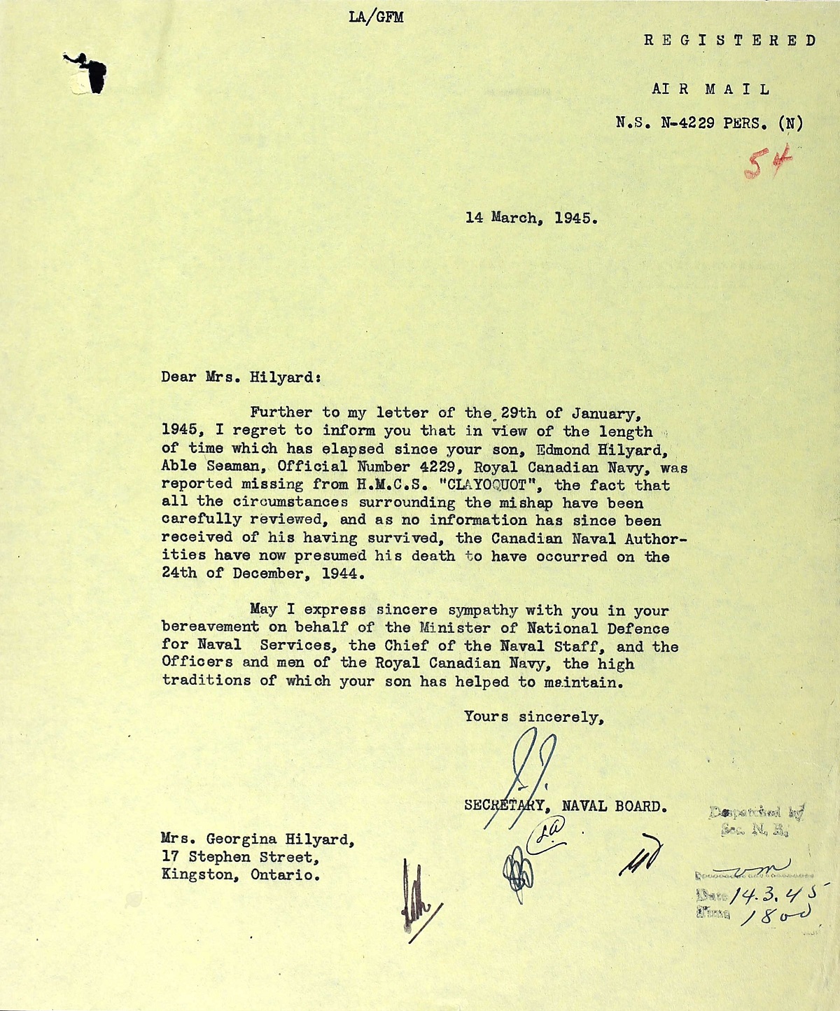AB Hilyard died when ship, HMCS CLAYOQUOT, was torpedoed by U-806 on 24 Dec 1944.