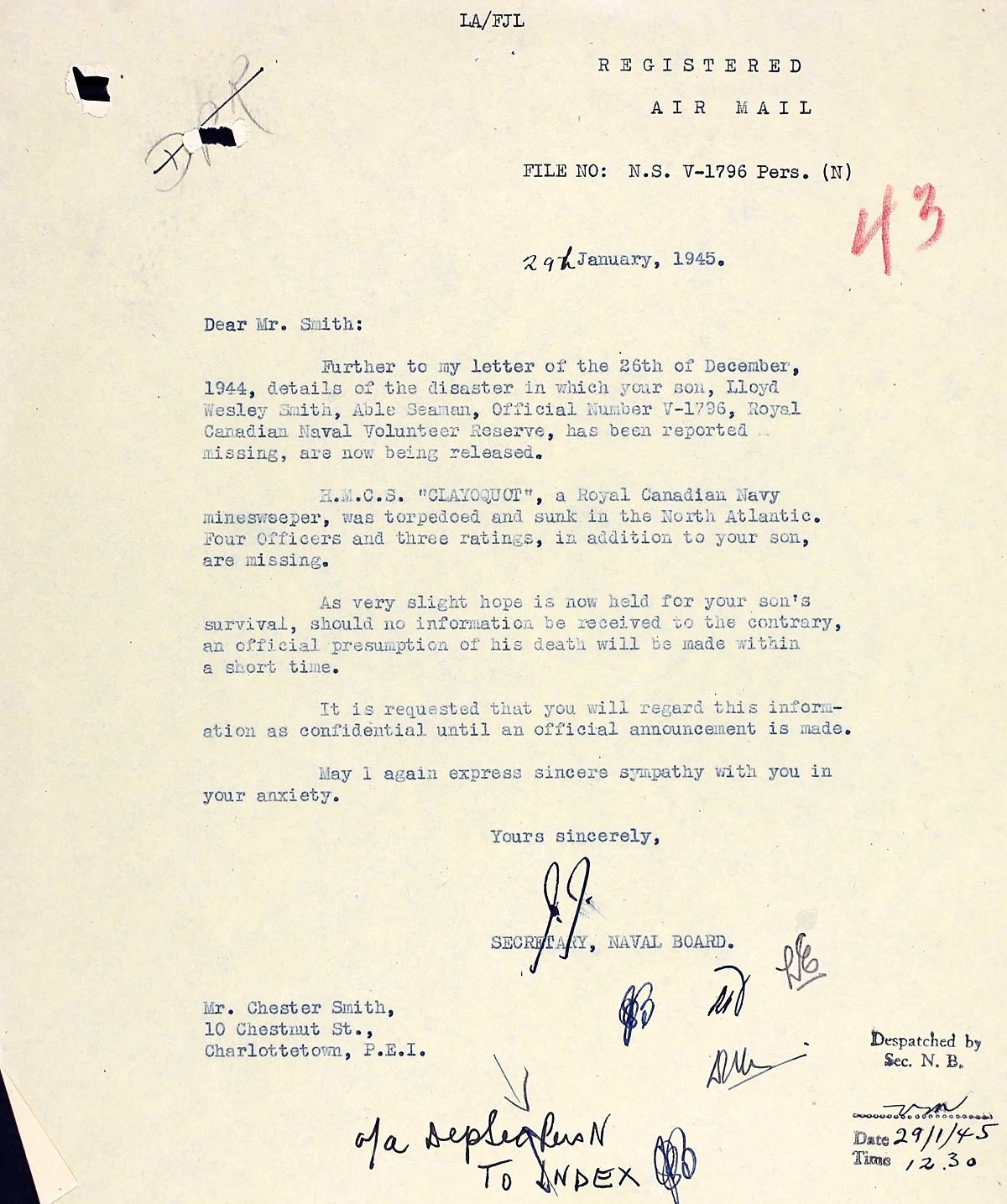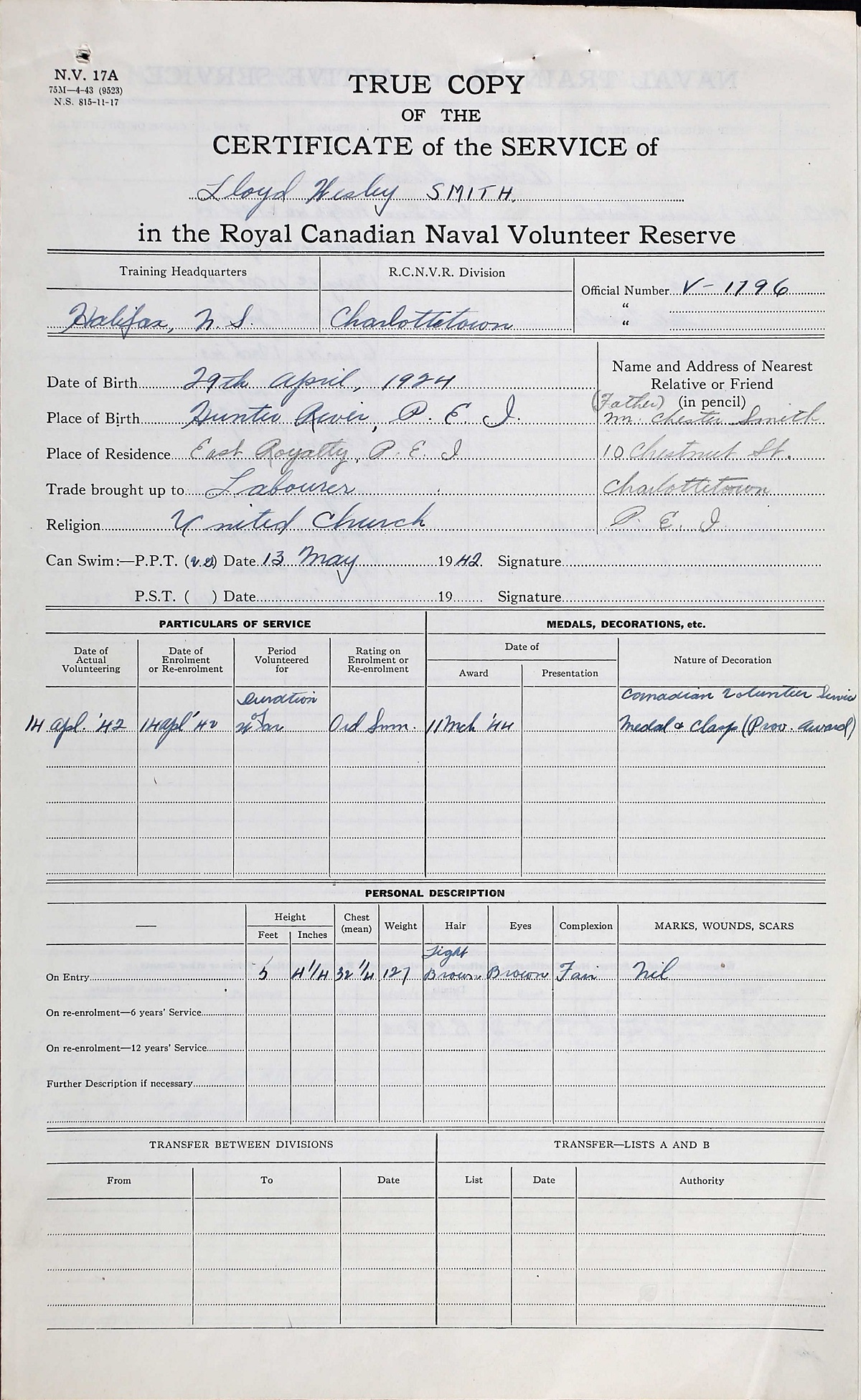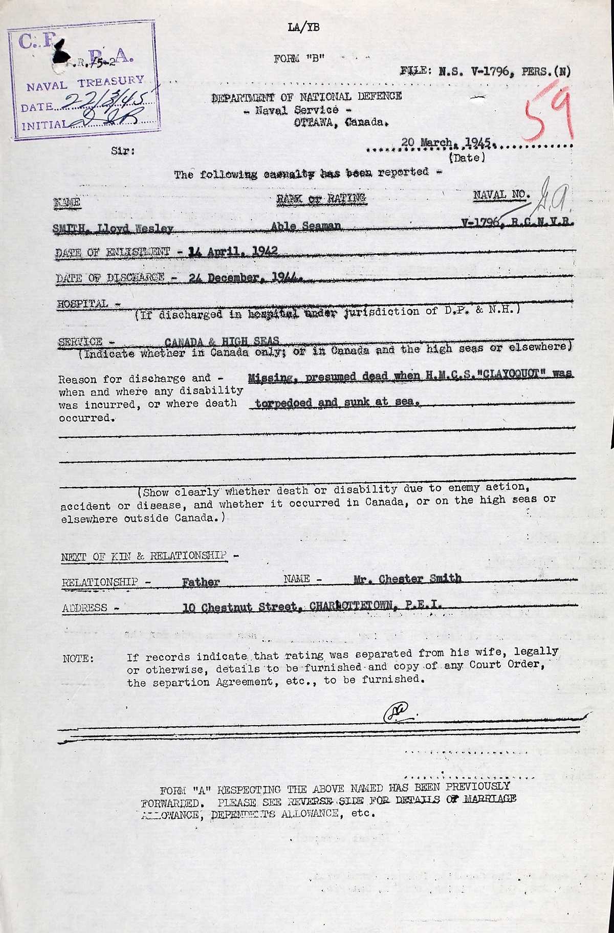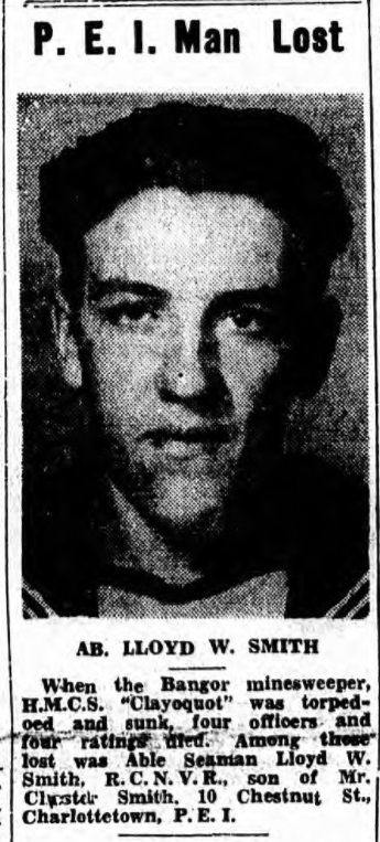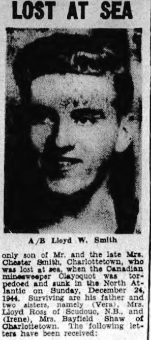 SMITH, Lloyd Welsey, AB, V1796, RCNVR, MPK - 24 Dec 1944, HMCS CLAYOQUOT - Son of Mr. and Mrs. Chester Smith, of Charlottetown, Prince Edward Island.
