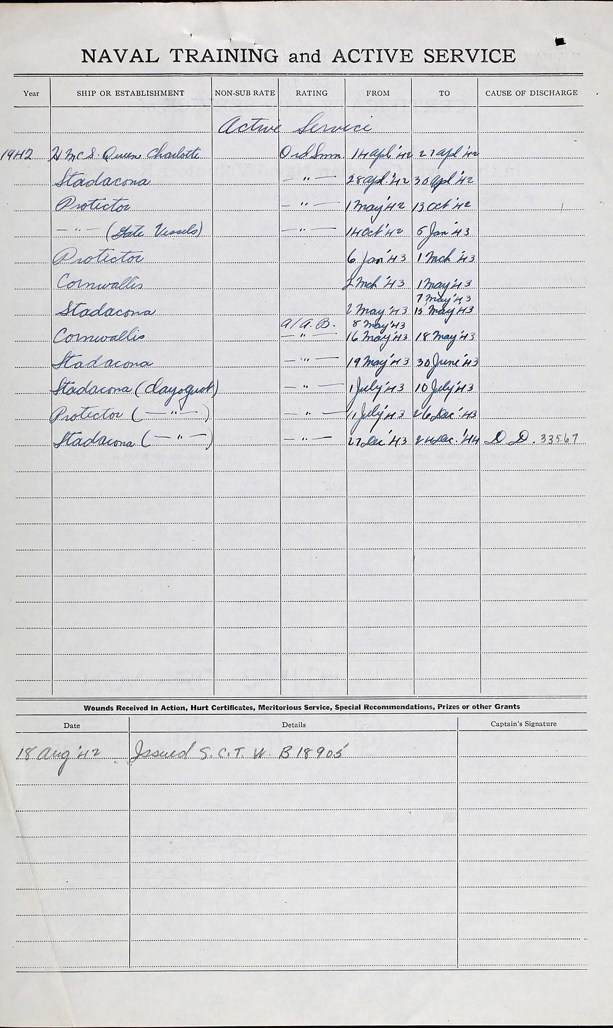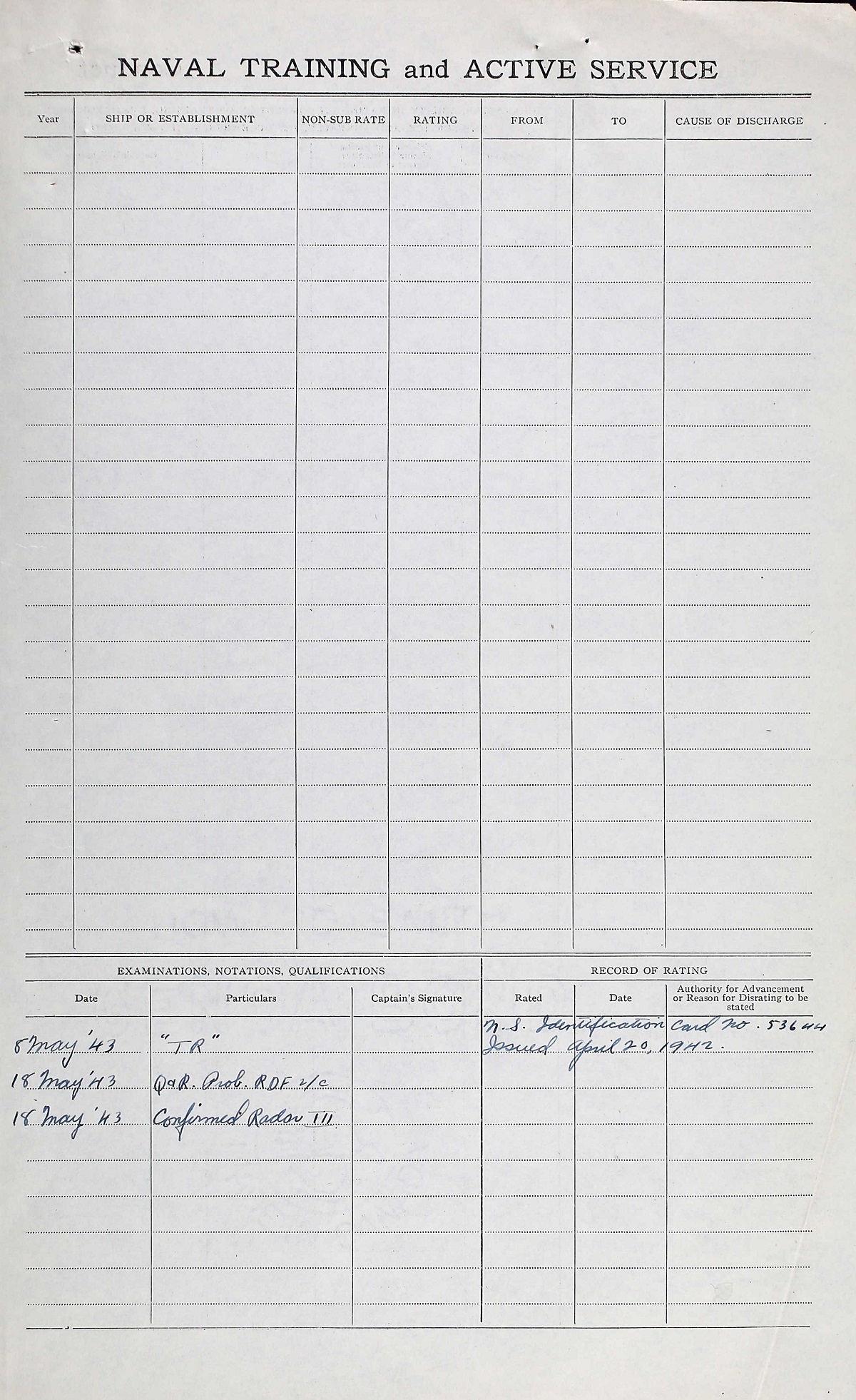 Ships served in: CHARLOTTETOWN DIVISION RCNVR - Enlisted 14 Apr 1942. Commenced Active Service 14 Apr 1942 * Rated Radar 3c 18 May 1943 HMCS CLAYOQUOT - Drafted to CLAYOQUOT 01 Jul 1943 as an A/AB, RCNVR