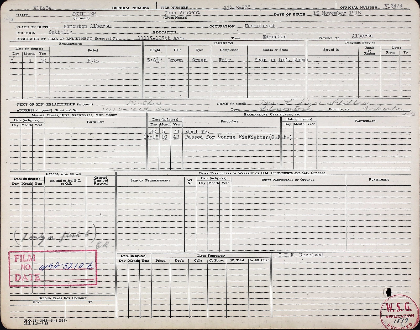 Ships served in: EDMONTON DIVISION RCNVR - Enlisted 09 Sep 1940. Commenced Active Service 16 Dec 1940 HMCS GIVENCHY - Served in GIVENCHY 09 Jul 1941 - 23 Aug 1941 as an OS, RCNVR HMCS PRINCE HENRY Served in PRINCE HENRY 24 Aug 1941 - 01 Oct 1941 as an OS, RCNVR HMCS KAMSACK - Served in KAMSACK 16 Oct 1941 - 16 Jul 1942 as an OS and AB LR III, RCNVR. Rated AB 07 Jan 1942 HMCS IROQUOIS - Drafted to IROQUOIS 27 Sep 1942 as an AB LR III, RCNVR