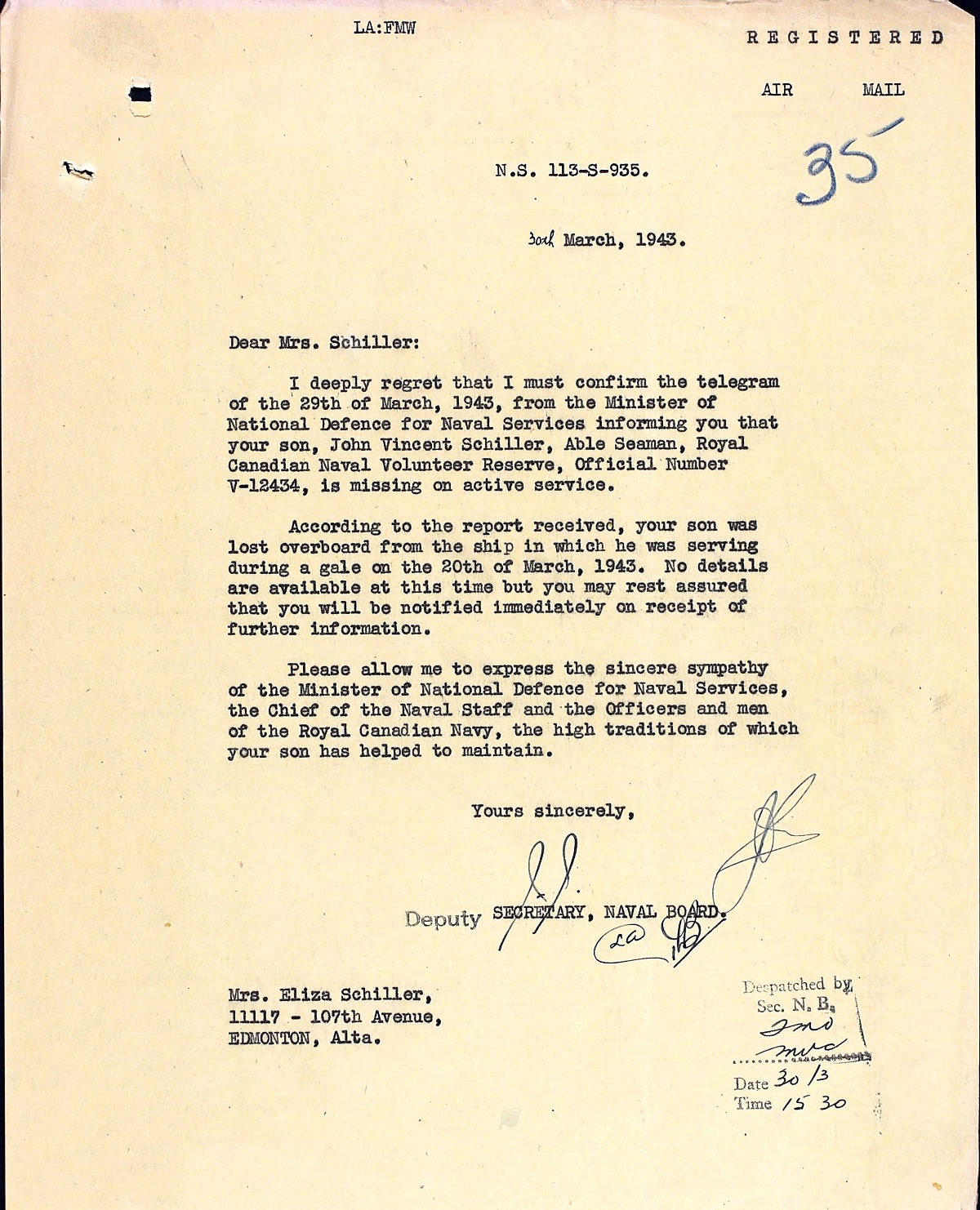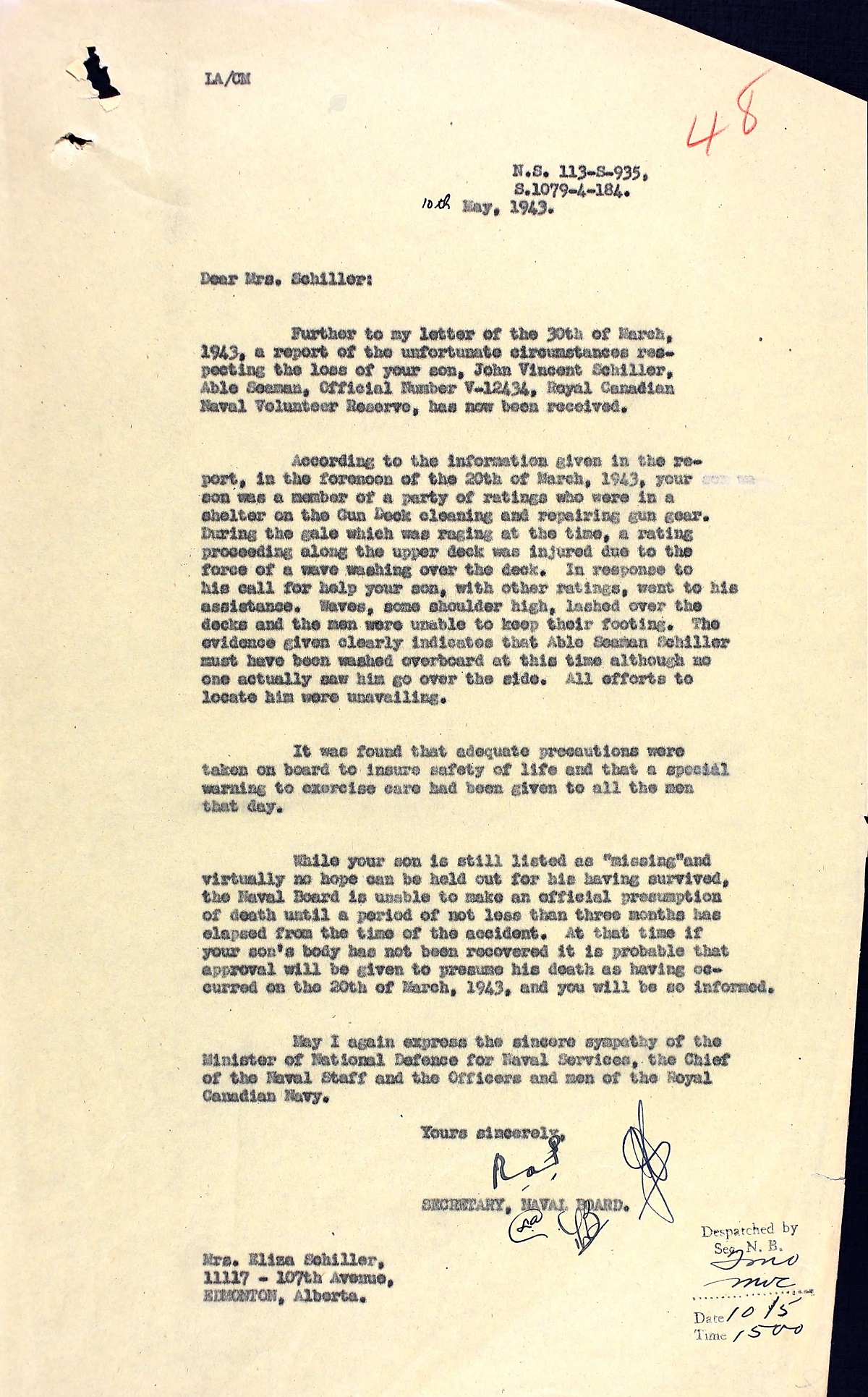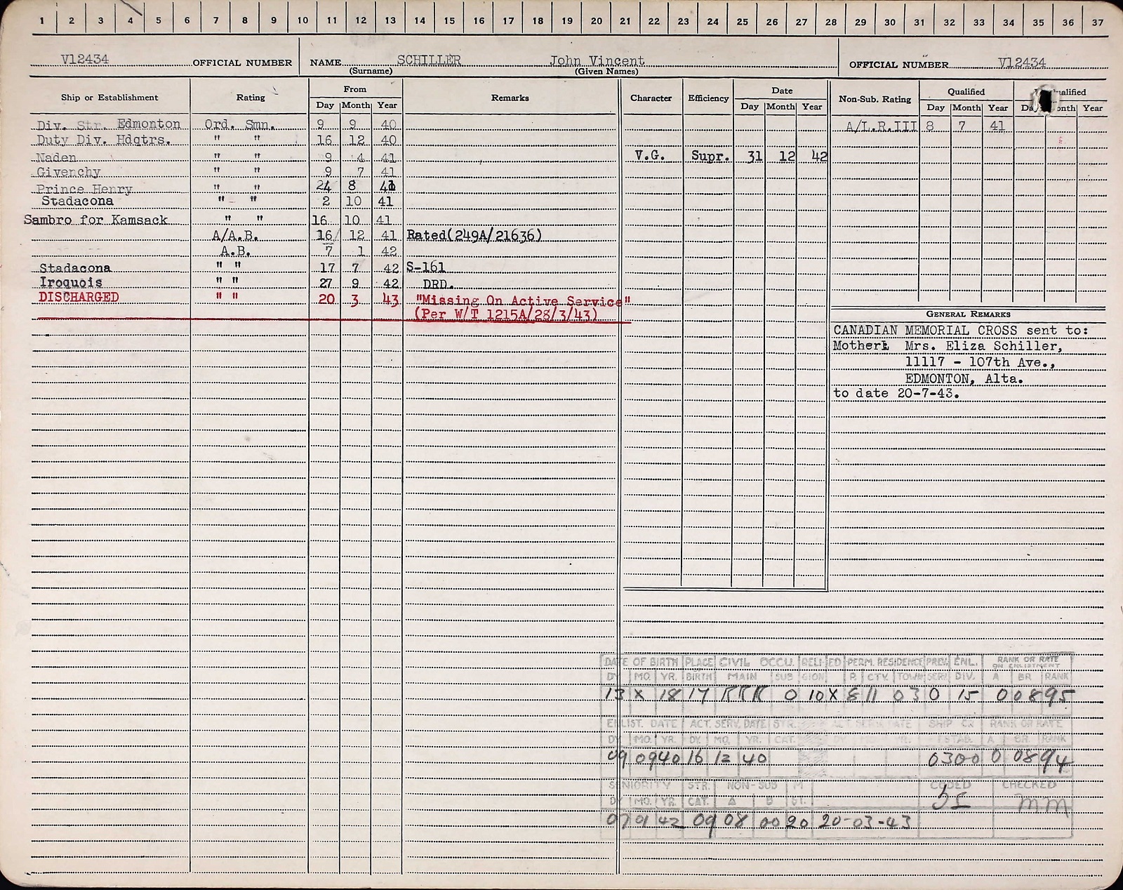 SCHILLER, John Vincent, AB, V12434, RCNVR, MPK - 20 Mar 1943, HMCS IROQUOIS - Son of Mrs. Eliza A. Schiller, of Edmonton, Alberta.