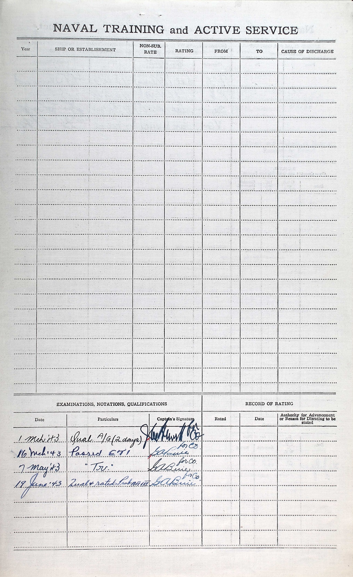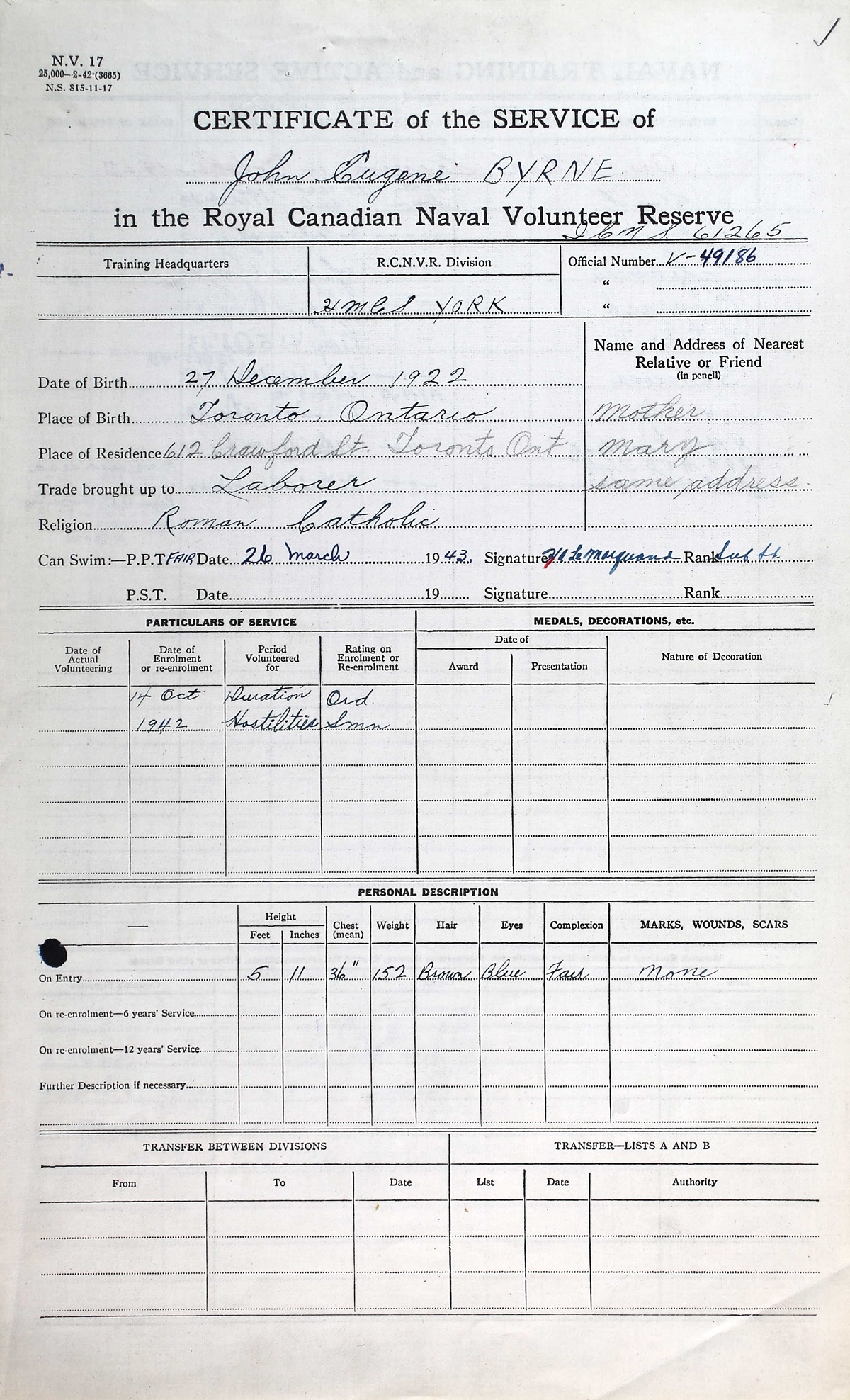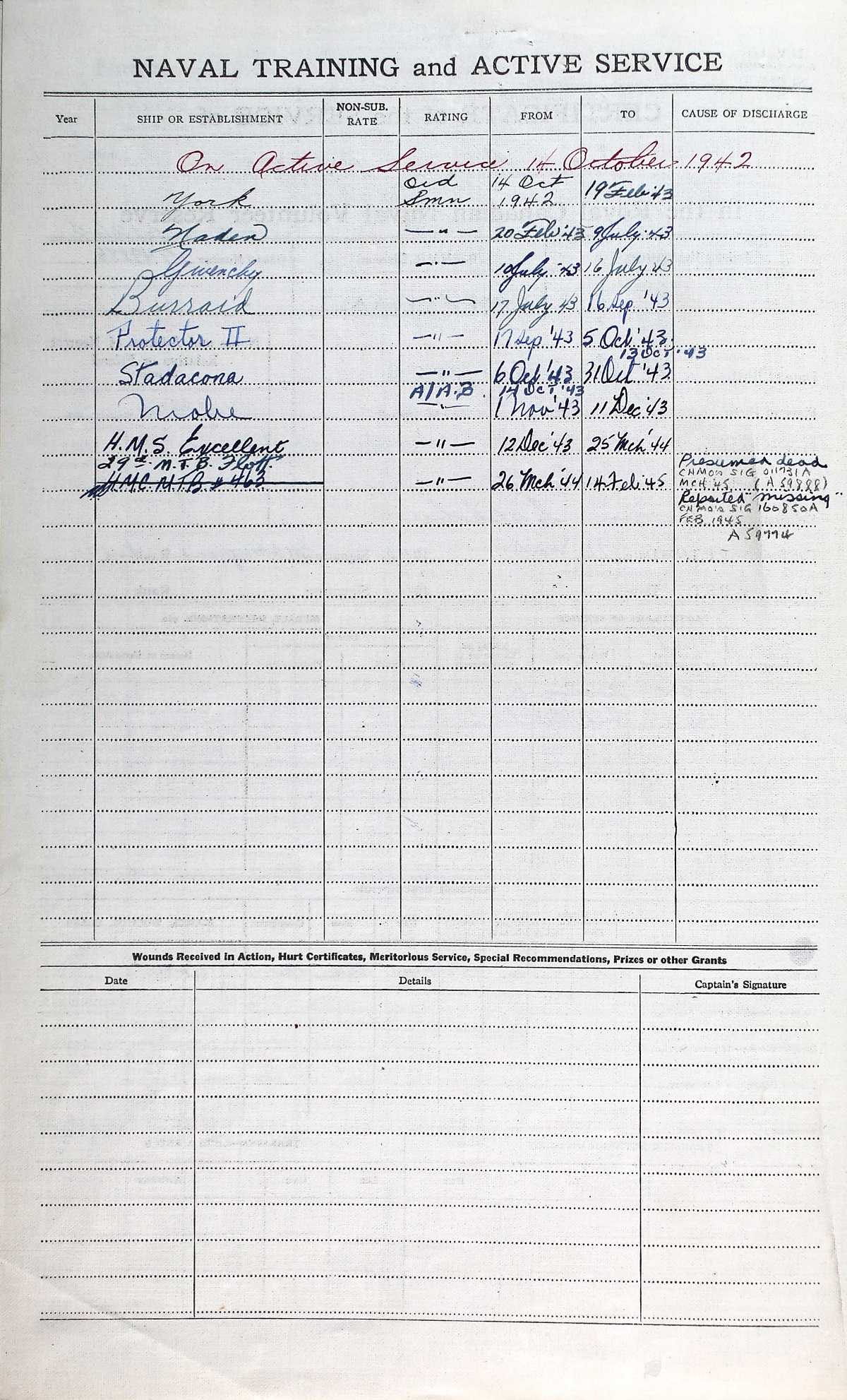 Ships served in: HMCS YORK - Enlisted / Commenced Active Service 14 Oct 1942 HMCS GIVENCHY - Served in GIVENCHY 10 Jul 1943 - 16 Jul 1943 as an OS, RCNVR 29th MTB FLOTILLA - Drafted to the 29th MTB FLOTILLA 26 Sep 1944 as an A/AB, RCNVR