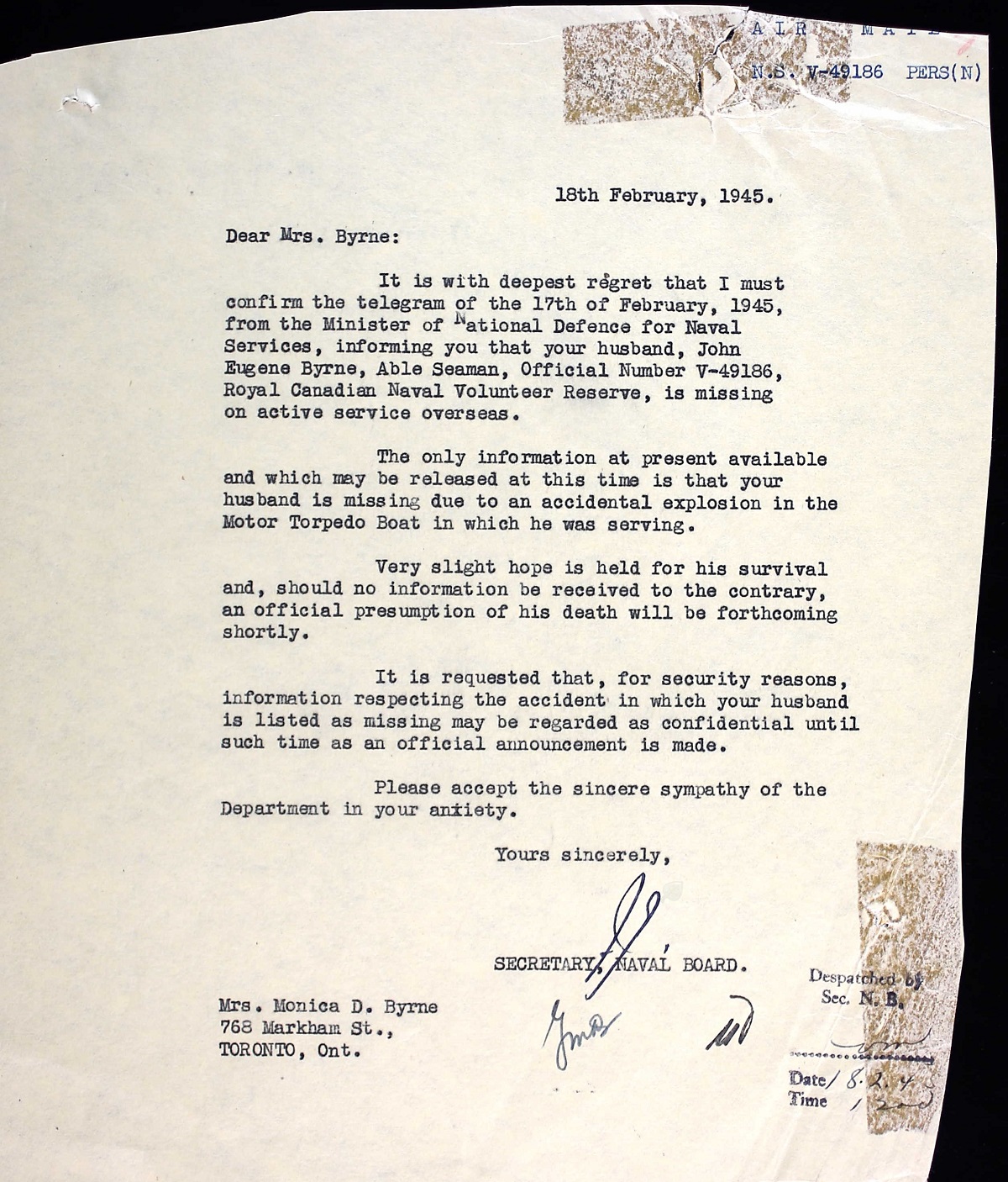 BYRNE, John Eugene, AB AA3, V49186, RCNVR, MPK - 14 Feb 1945, 29th MTB FLOTILLA - Son of Owen and Mary Byrne, of Toronto, Ontario. Husband of Monica Dorothy Byrne, of Toronto.