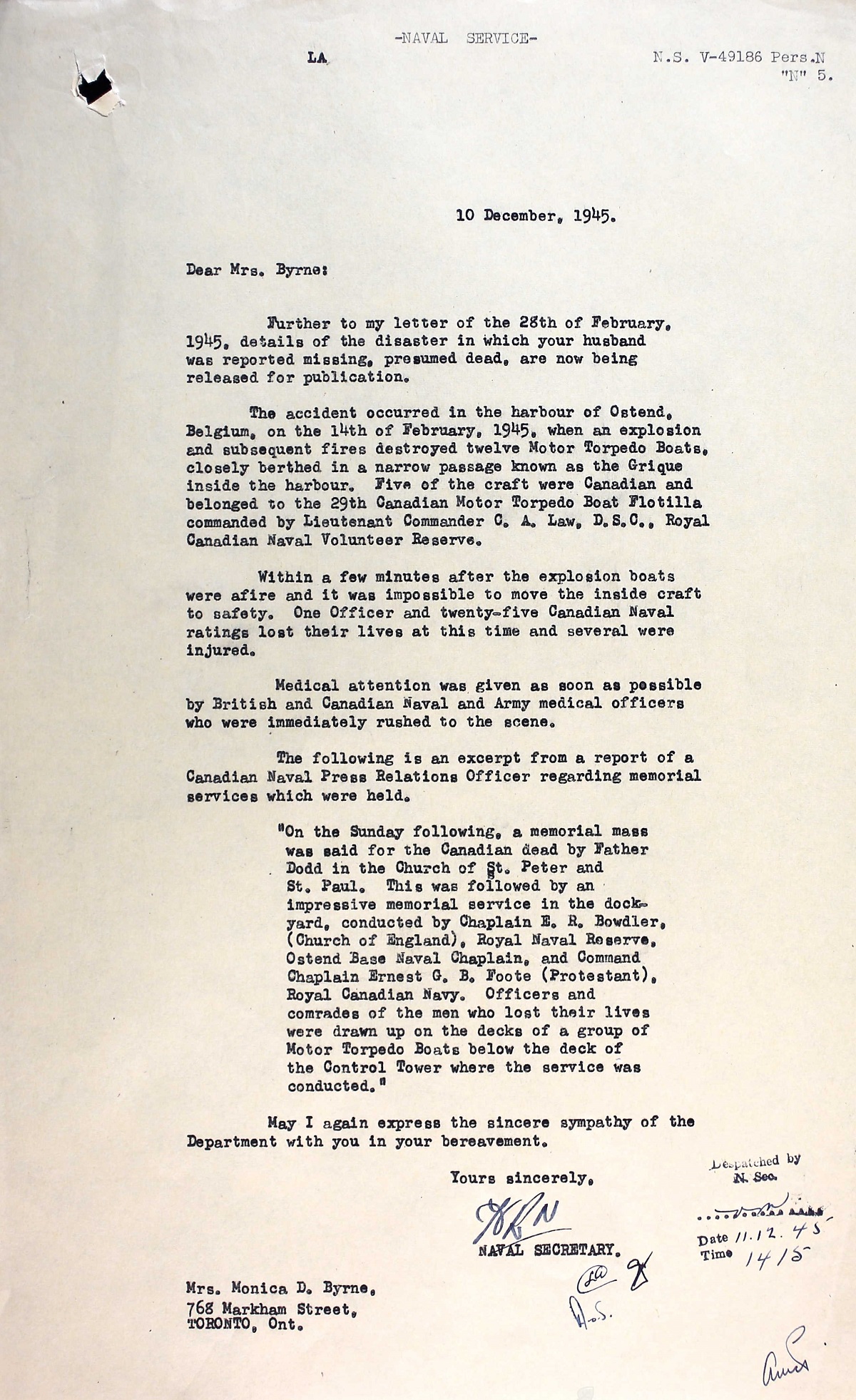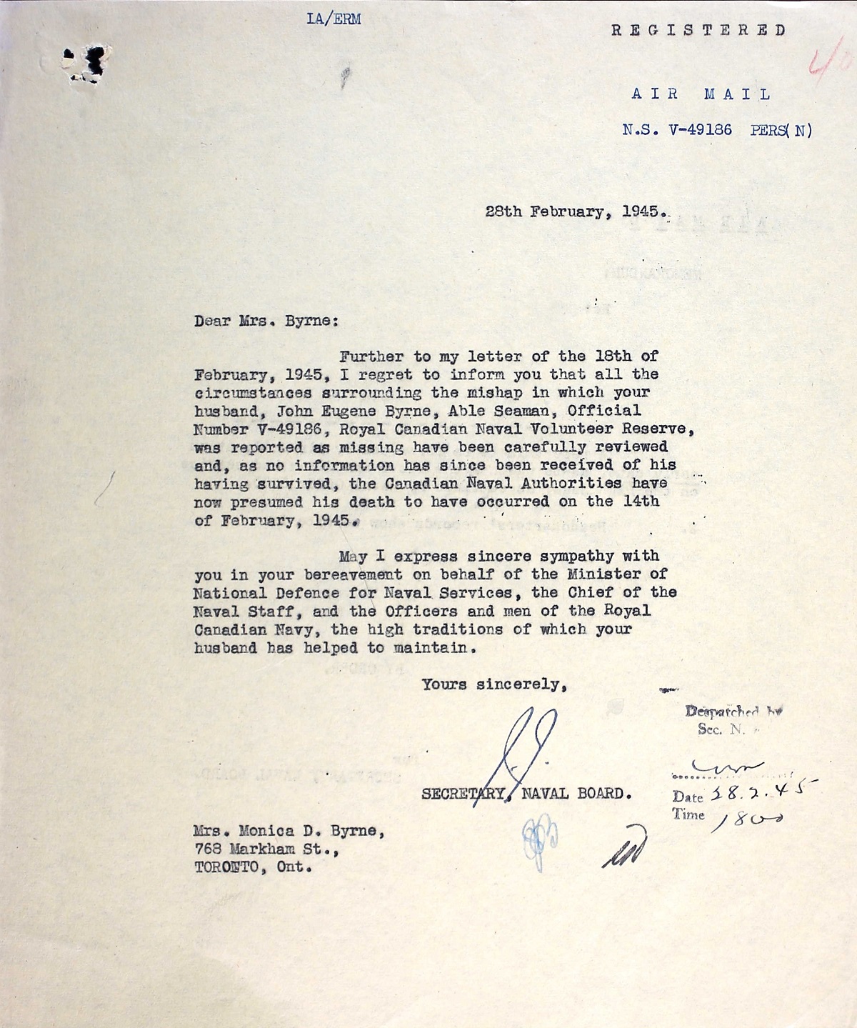 Able Seaman, Jack Eugene Byrne, 22 R.C.N.V.R., has been missing and presumed dead since Feb. 14, after an accidental explosion in Belgium, according to word received by his wife, the former Monica Irish, 768 Markham St. Born in Toronto, Able Seaman Byrne was educated at St. Mary's and Corpus Christi separate schools and De La Salle Collegiate. Enlisting in the navy in October, 1942, Able Seaman, Byrne was stationed at HMCS York and also at Esquimalt and Sydney, N.S., before going overseas in November, 1943. He was aboard a motor torpedo boat for a short time, and was then stationed in England. In January Able Seaman, Byrne was awarded a medal for gallantry, but further details are not yet known by his wife. He is the son of Mr. and Mrs. Owen Byrne of Toronto.