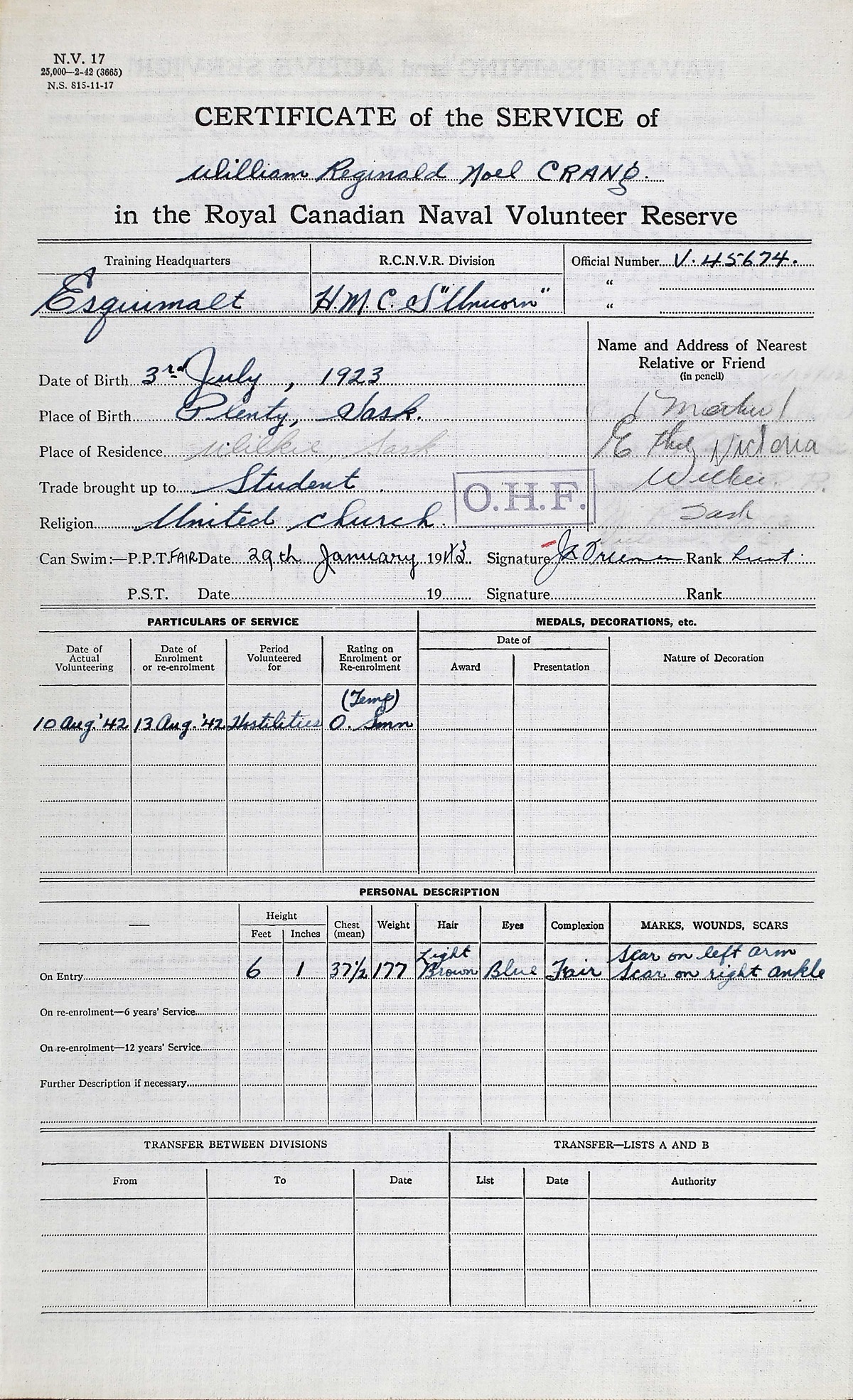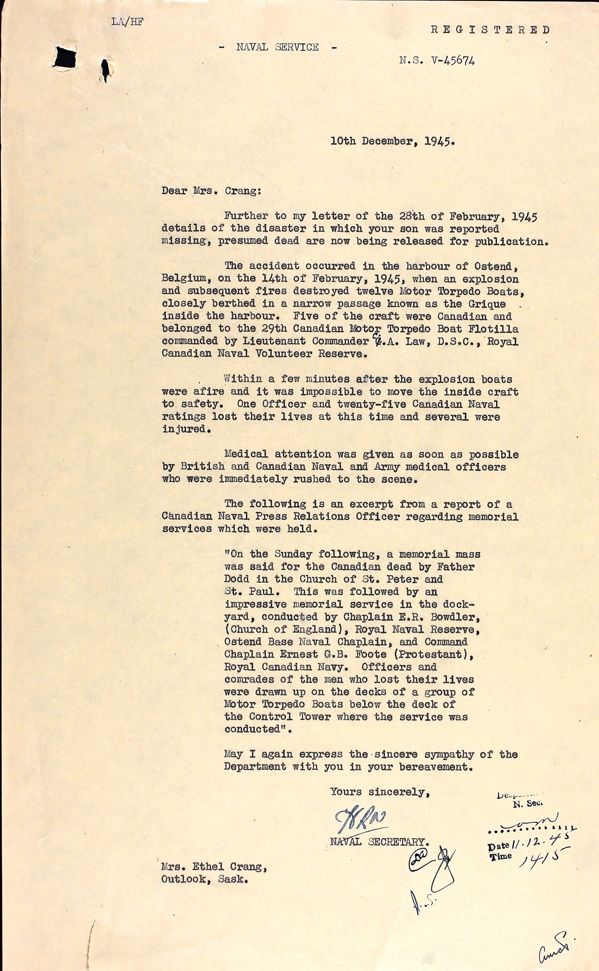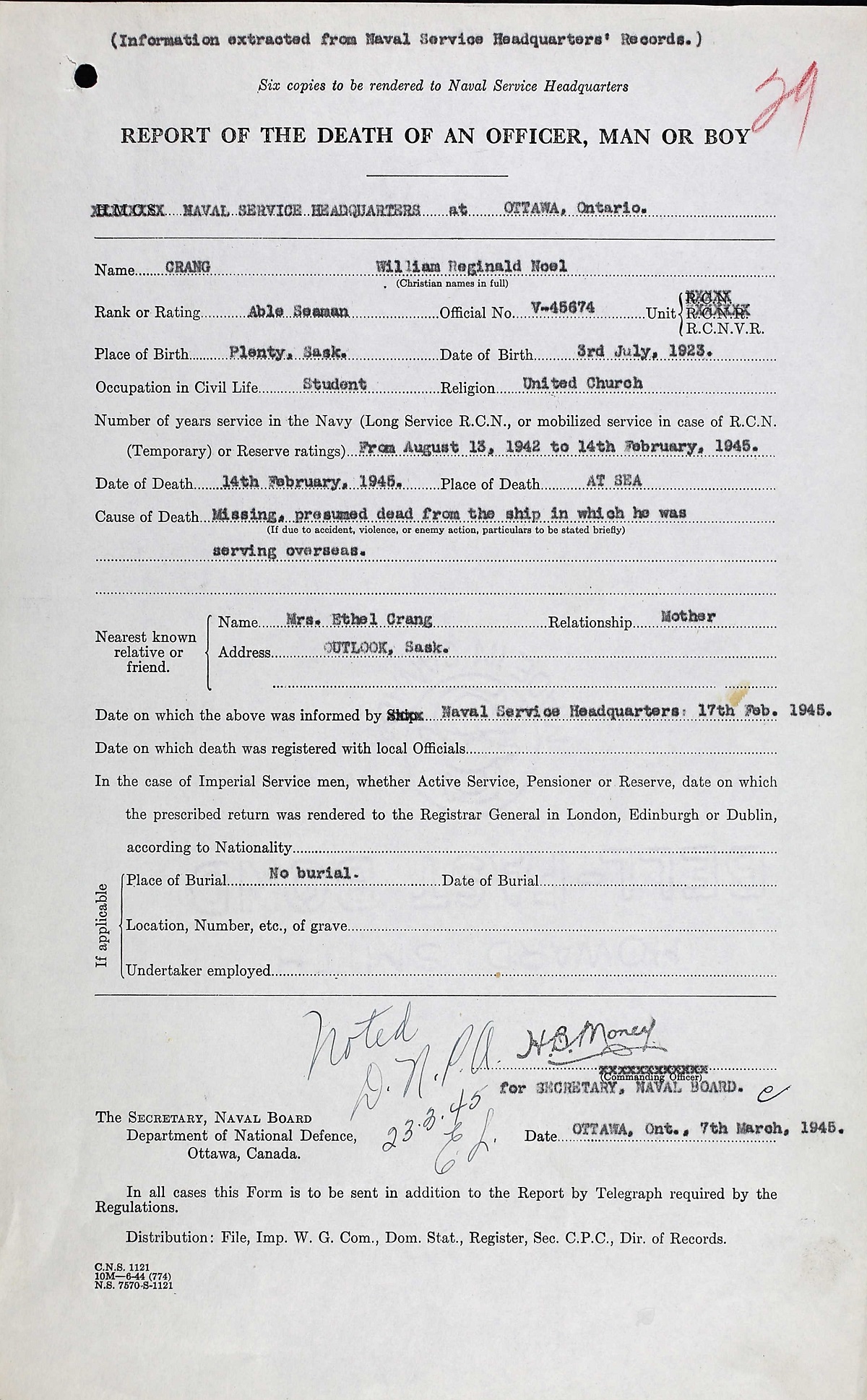 CRANG, William Reginald Noel, AB, V45674, RCNVR, MPK - 14 Feb 1945, 29th MTB FLOTILLA - Son of Leslie John and Ethel Victoria Crang, of Outlook, Saskatchewan. Brother of Robert, Edith and Ethel.