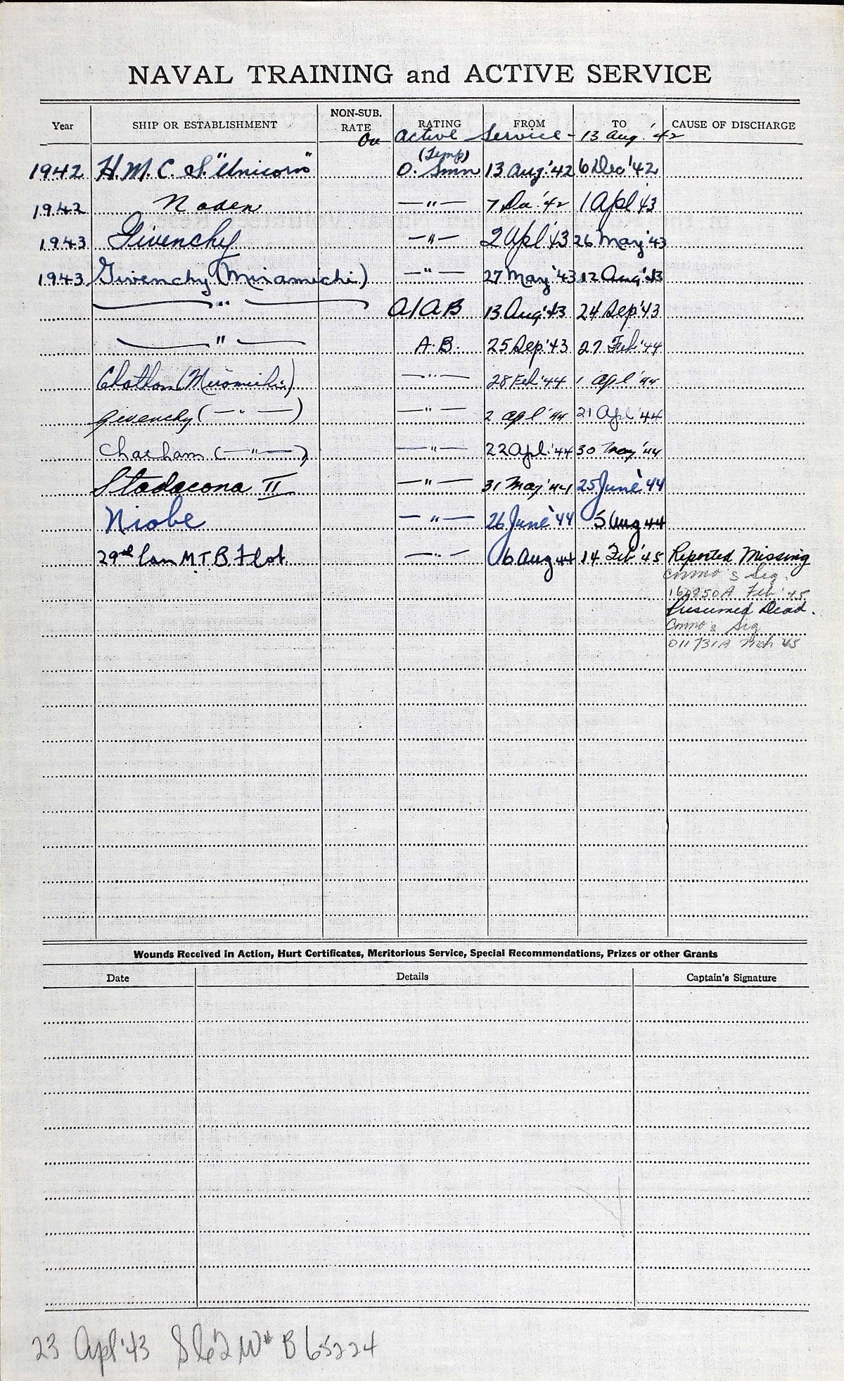 Ships served in: HMCS UNICORN - Enlisted / Commenced Active Service 13 Aug 1942 HMCS GIVENCHY - Served in GIVENCHY 02 Apr 1943 - 26 May 1943 as an OS, RCNVR HMCS MIRAMICHI - Served in MIRAMICHI 27 May 1943 - 31 May 1944 as an OS and AB, RCNVR. Rated AB 25 Sep 1943 * Rated LR III 25 Dec 1943 29TH MTB FLOTILLA - Drafted to the 29TH MTB FLOTILLA 06 Aug 1944 as an AB, RCNVR