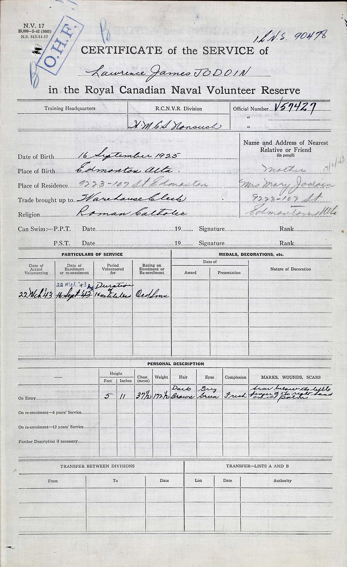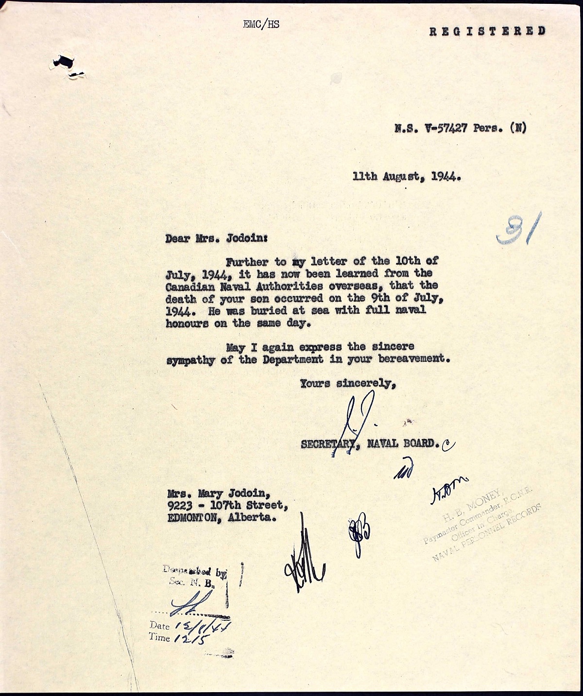 JODOIN, Lawrence James, AB AAIII, V57427, RCNVR, killed - 09 Jul 1944, MTB-461 - Son of Arthur and Mary Jodoin, of Edmonton, Alberta.