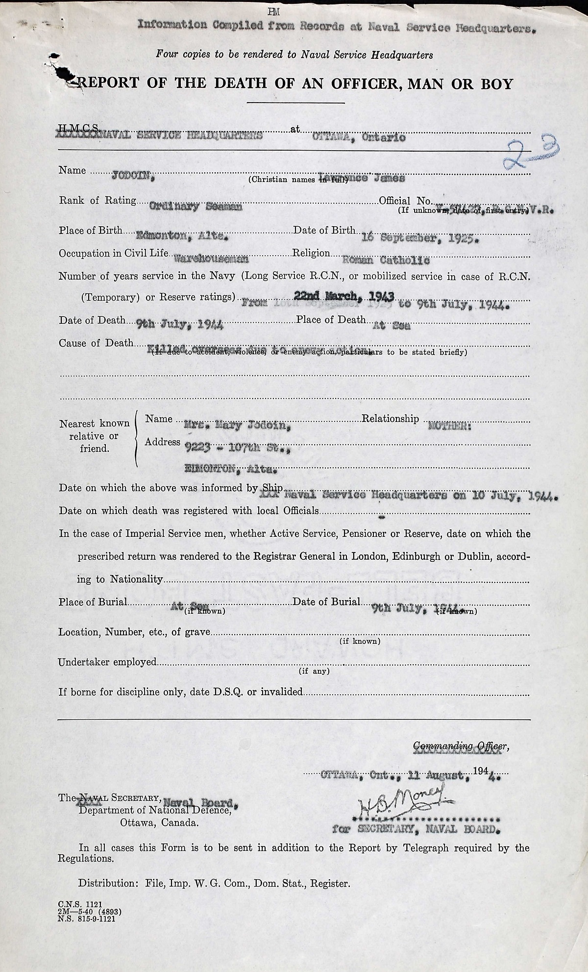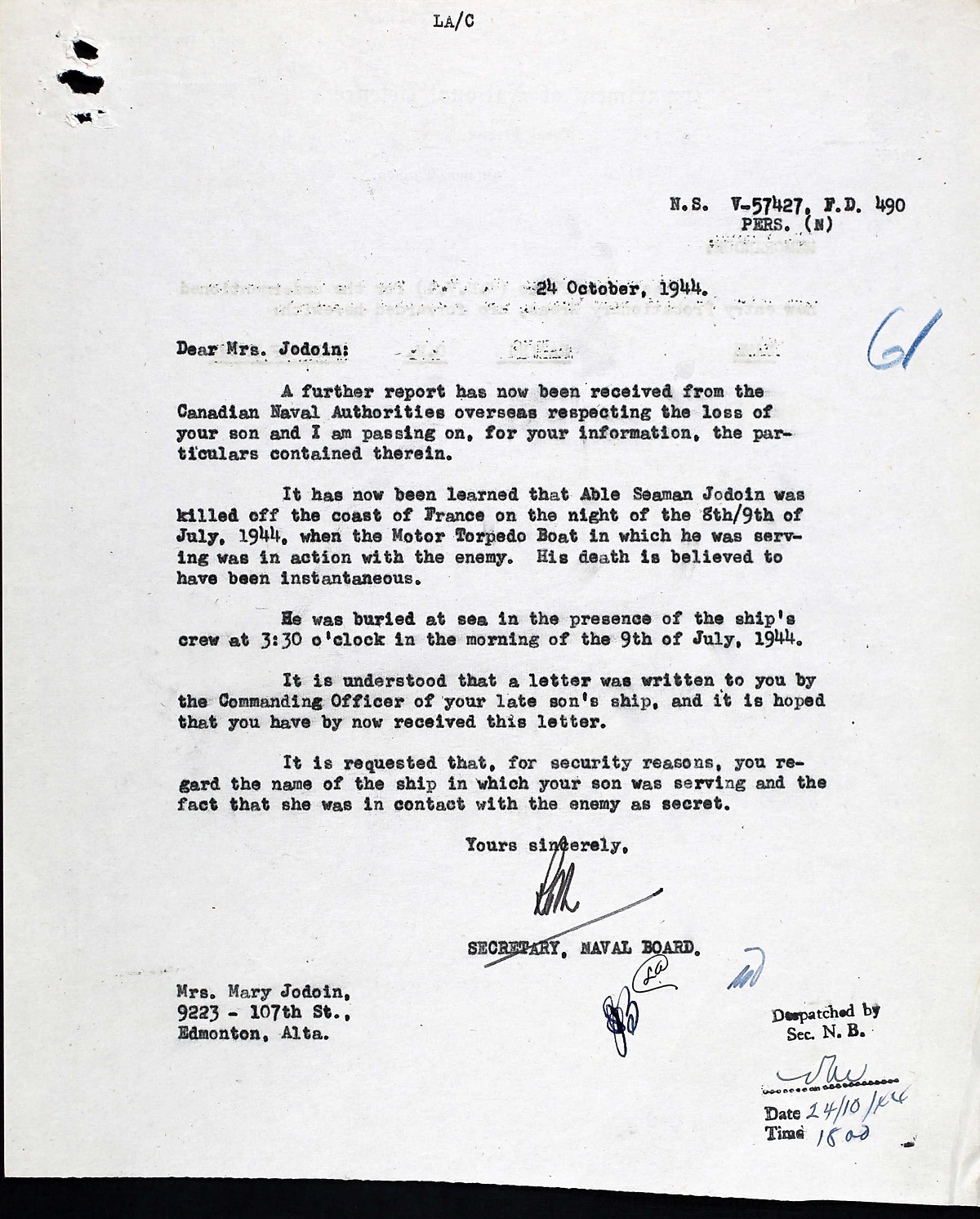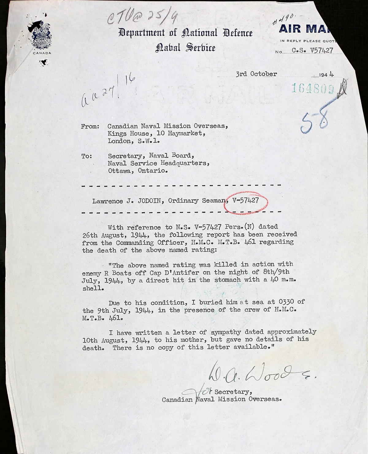 Able Seaman L. J. Jodoin was killed instantly serving on MTB-461 which was off the French coast near Cap D'Antifer. Lawrence received a direct hit to the stomach from a 40 mm. German shell. He was buried at sea.