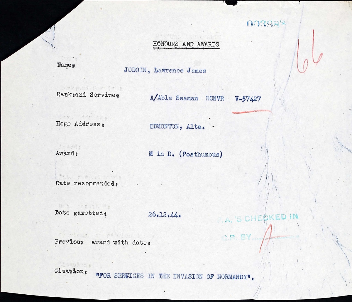 JODOIN, Lawrence James, A/AB, V57427, Mention in Despatches (Posthumous), RCNVR - Awarded as per Canada Gazette of 20 January 1945 and London Gazette of 26 December 1944 .