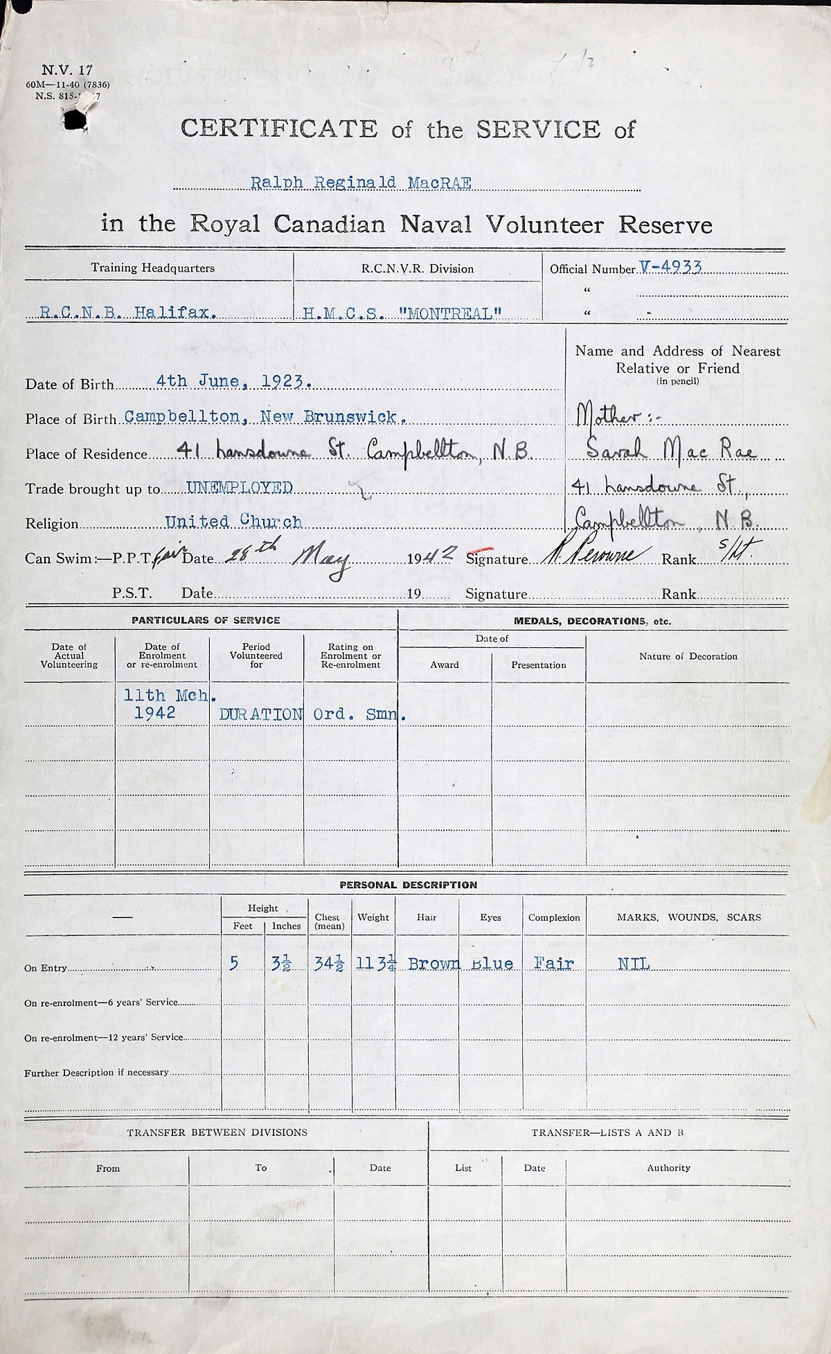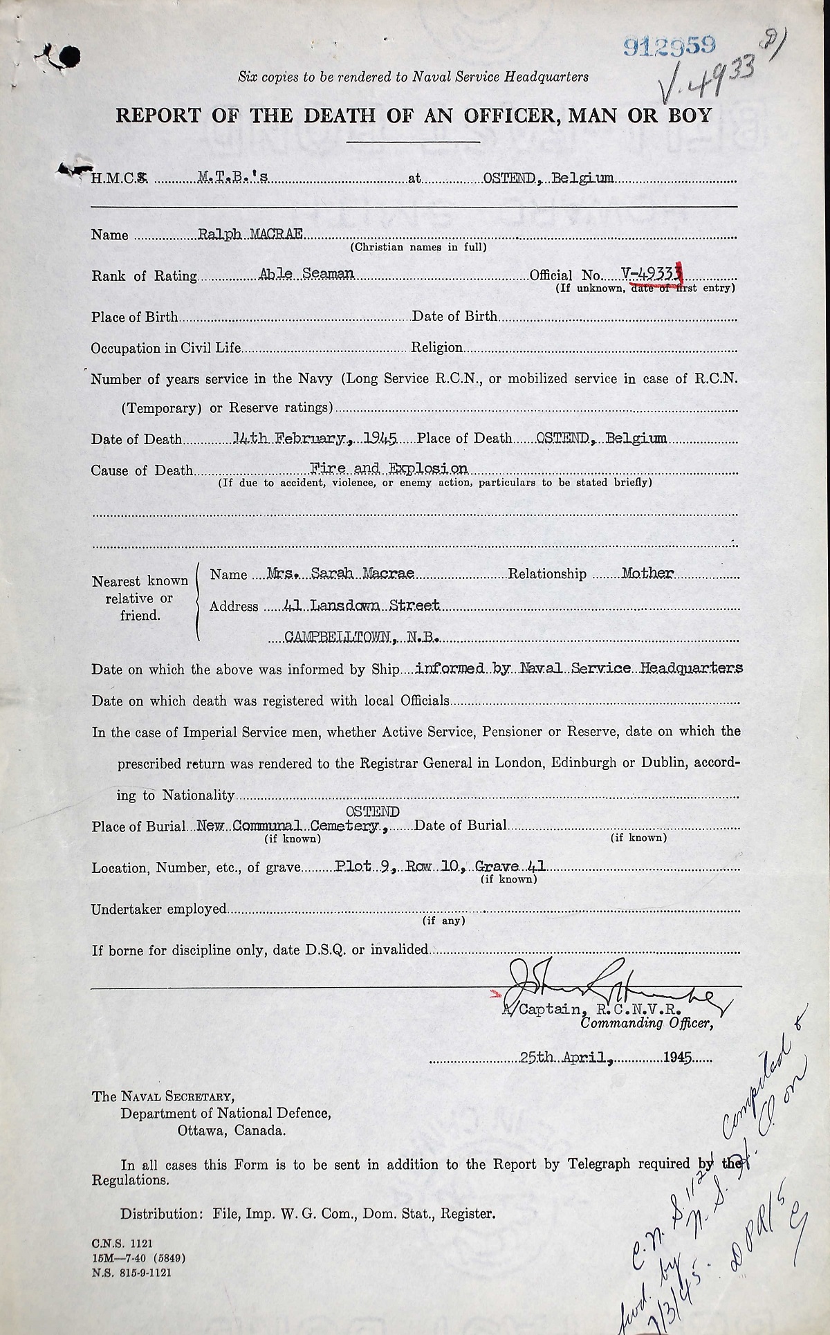 MACRAE, Ralph Reginald, LS, V4933, RCNVR, killed - 14 Feb 1945, MTB-461 - Son of Maj. Herbert Hudson MacRae and Sarah Maria MacRae, of Campbellton, New Brunswick, Canada.