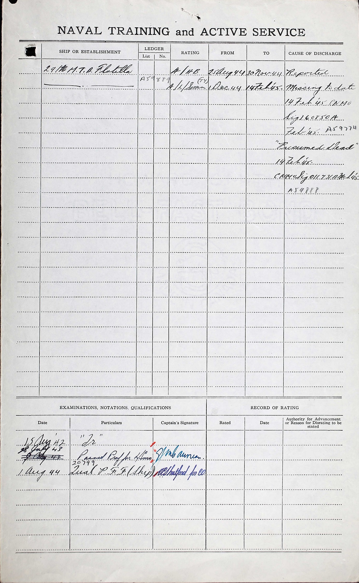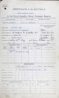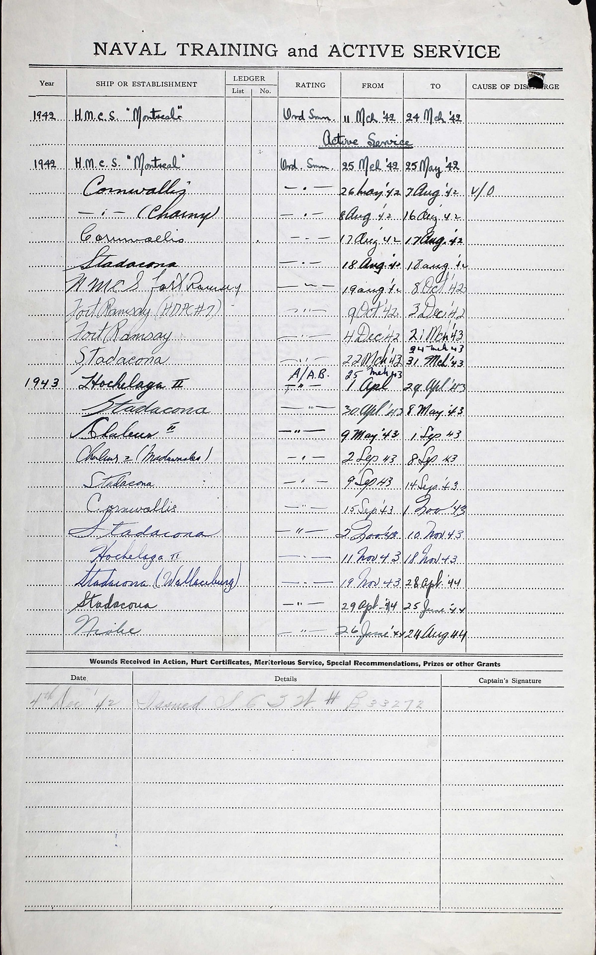 Ships served in: HMCS MONTREAL - Enlisted 11 Mar 1942. Commenced Active Service 25 Mar 1942 HMCS CHARNY - Served in CHARNY 08 Aug 1942 - 16 Aug 1942 while in training at HMCS CORNWALLIS HDPC # 7 - Served in HDPC #7 09 Oct 1942 - 03 Dec 1942 while serving in HMCS FORT RAMSAY HMCS WALLACEBURG - Served in WALLACEBURG 19 Nov 1943 - 28 Apr 1944 29th MTB FLOTILLA - Drafted to the 29th MTB FLOTILLA 25 Aug 1944 as an A/AB, RCNVR. Rated A/LS 01 Dec 1944 MTB-461 - Date drafted to MTB-461 unknown