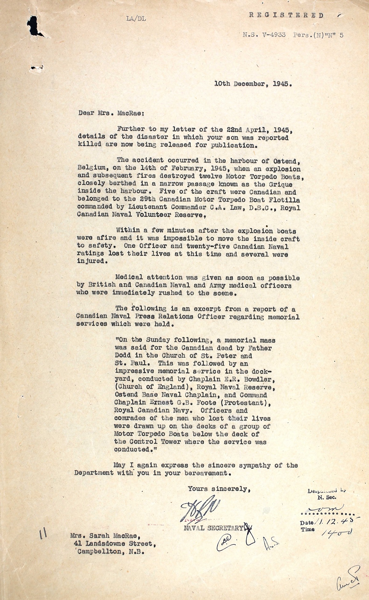 LS MacRae died when an accidental fire and explosion destroyed numerous MTBs in harbour at Ostend, Belgium. He is buried in the Ostende New Communal Cemetery, Belgium.