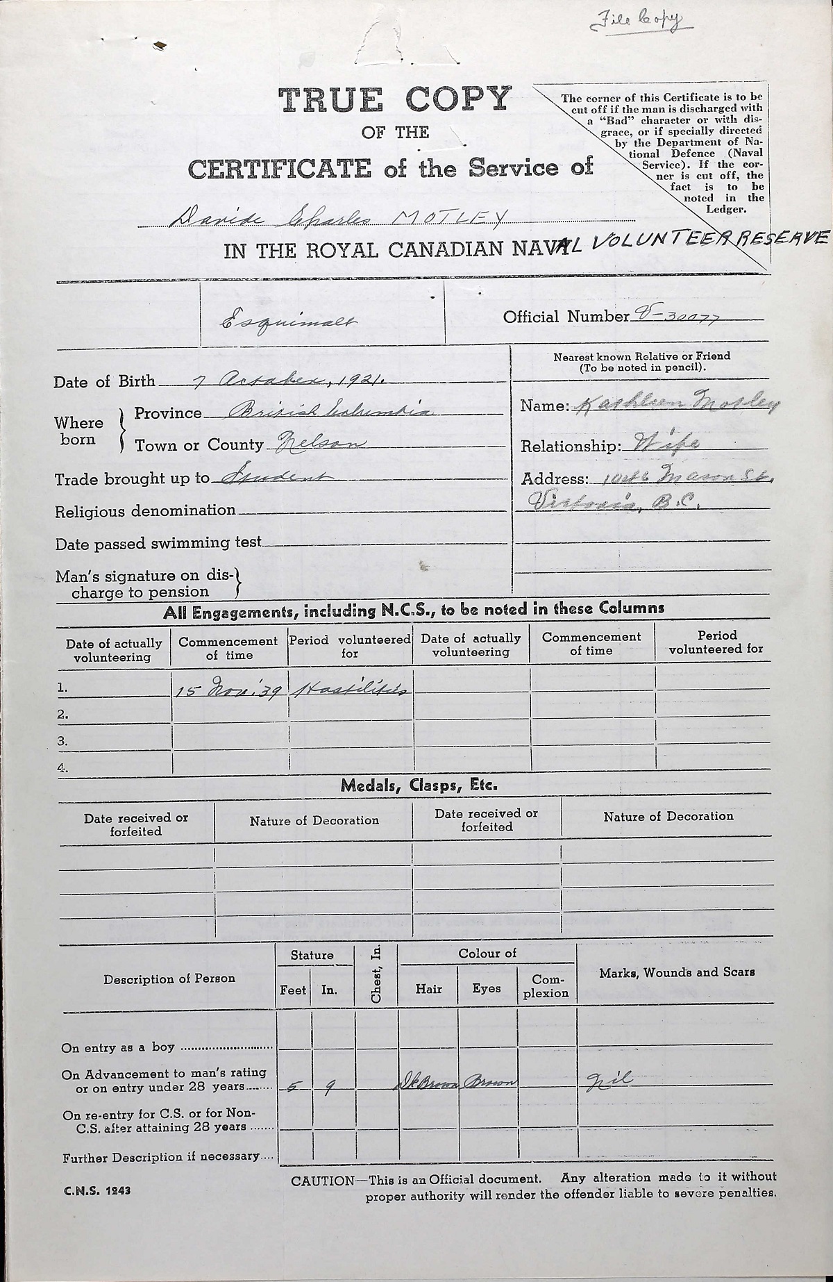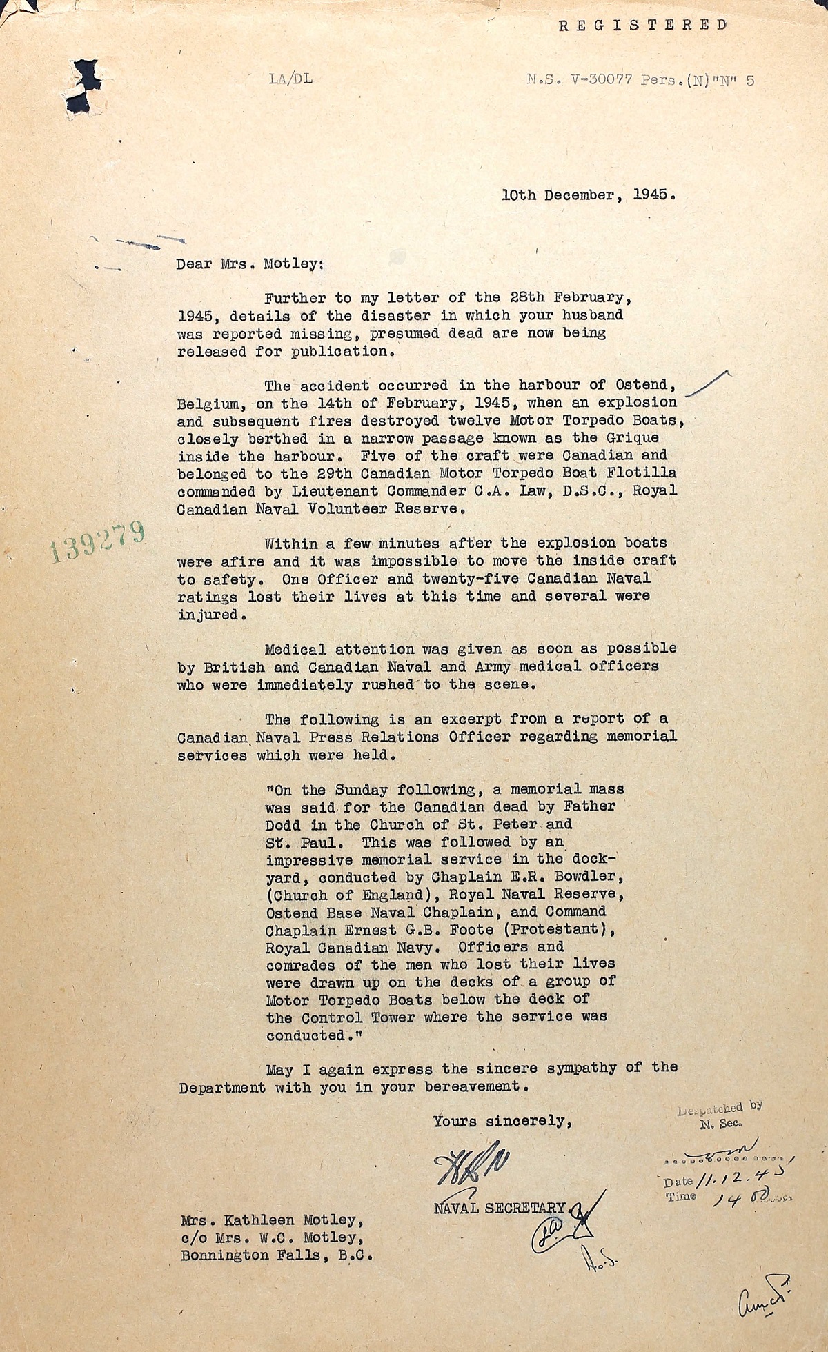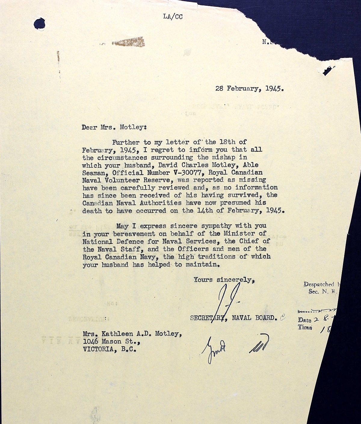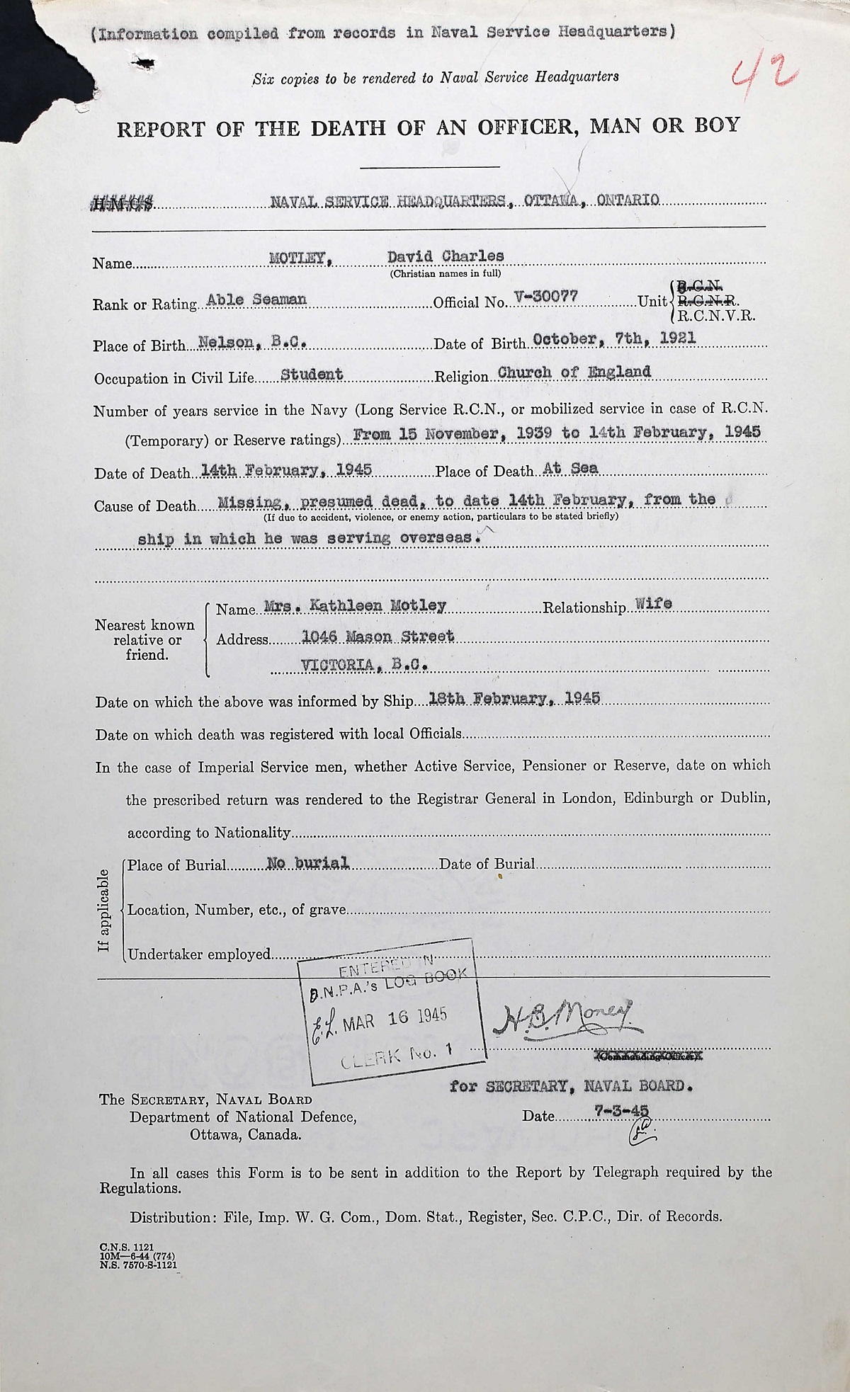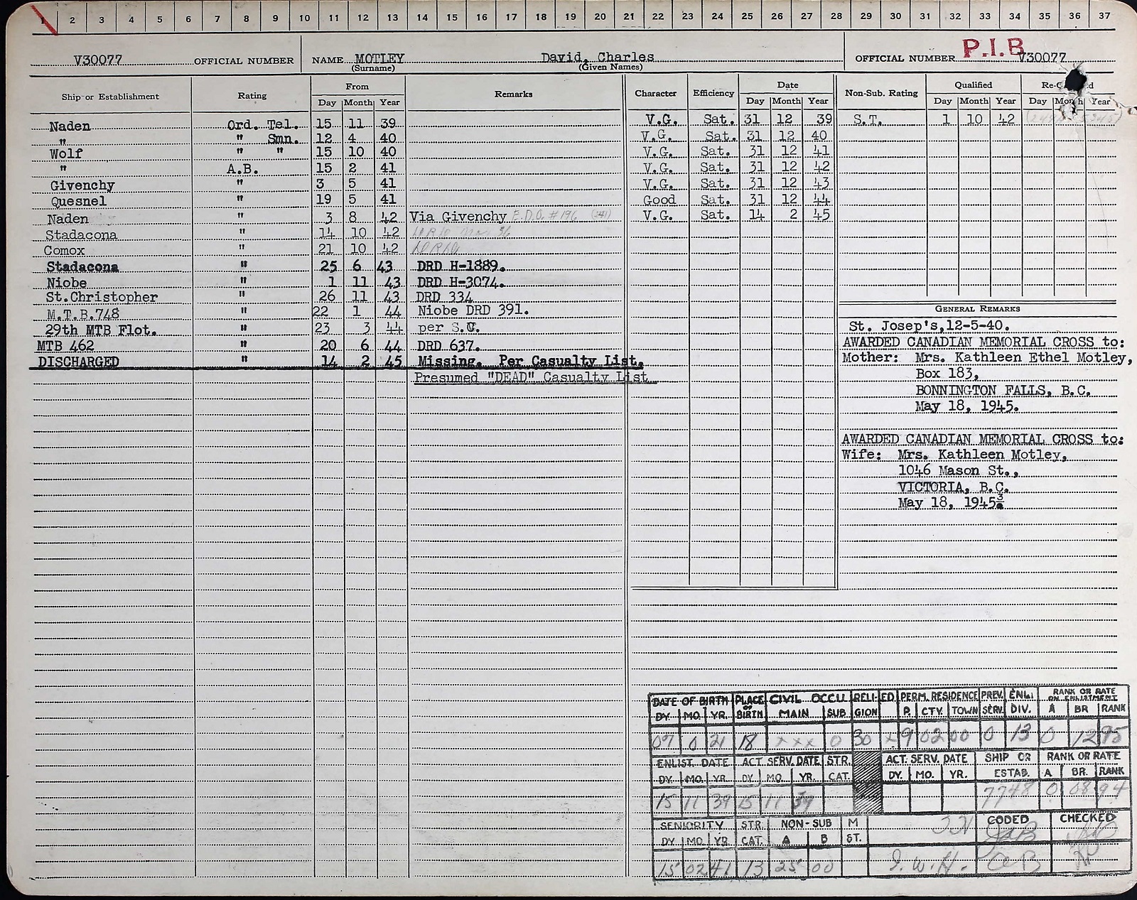 MOTLEY, David Charles AB ST, V30077, RCNVR, MPK - 14 Feb 1945, MTB-462 - Son of William Charles and Kathleen Ethel Motley, of Bonnington Falls, British Columbia; husband of Kathleen Audrey Motley, of Bonnington Falls.