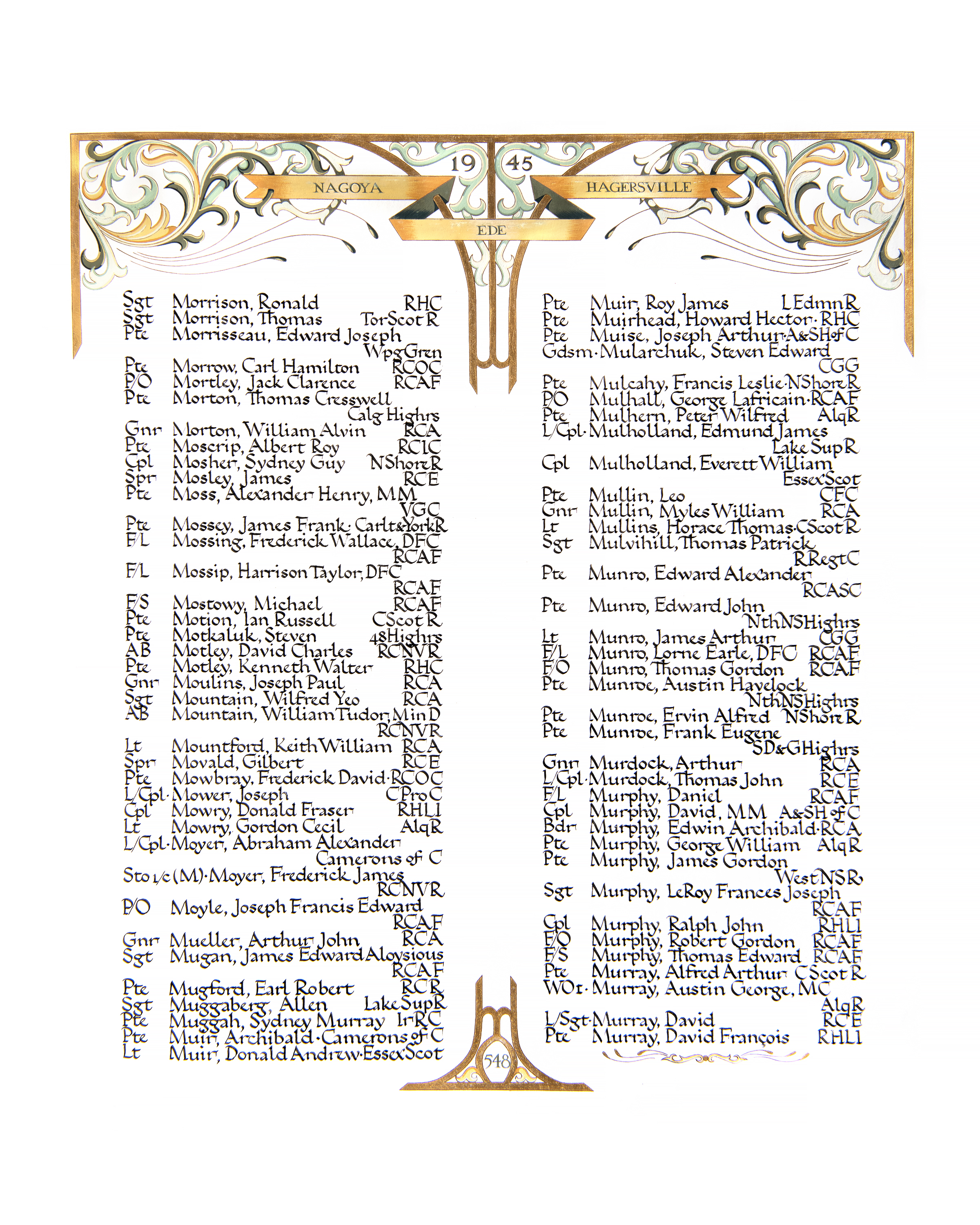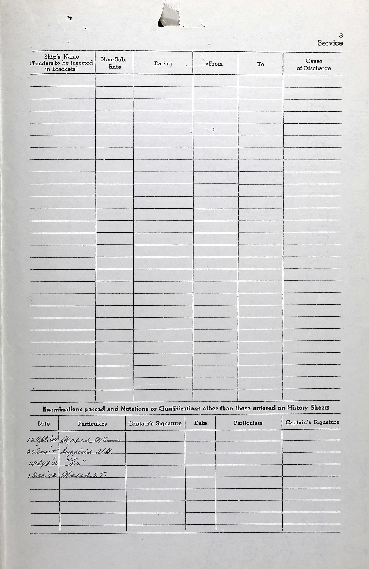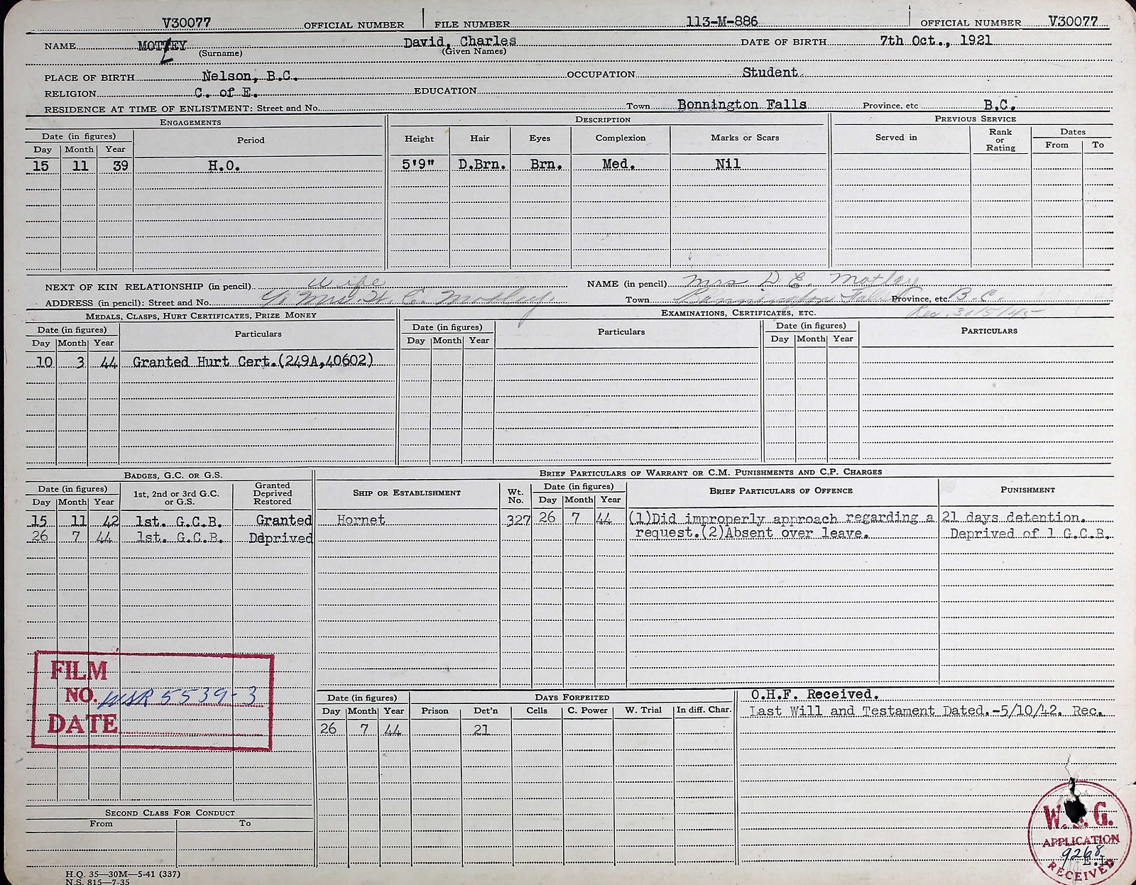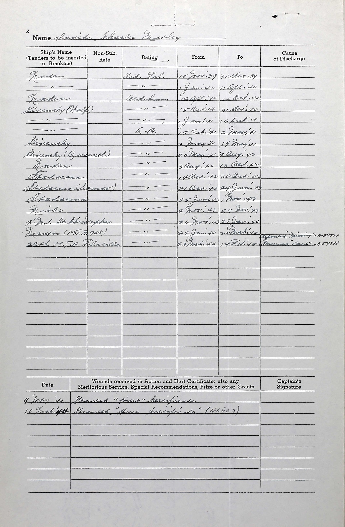 Ships served in: HMCS NADEN - Enlisted 15 Nov 1939 as an O/Tel. Rated OS 12 Apr 1940 HMCS WOLF - Served in WOLF 15 Oct 1940 - 02 May 1941 as an OS and AB, RCNVR. Rated AB 15 Feb 1941 HMCS GIVENCHY - Served in GIVENCHY 03 May 1941 - 19 May 1941 as an AB, RCNVR HMCS QUESNEL - Served in QUESNEL 20 May 1941 - 02 Aug 1942 as an AB, RCNVR * Rated Seaman Torpedoman 01 Oct 1942 HMCS COMOX - Served n COMOX 21 Oct 1942 - 24 Jun 1943 as an AB, RCNVR MTB-748 - Served in MTB-748 22 Jan 1944 - 22 Mar 1944 29th MTB FLOTILLA - Served in the 29TH MTB FLOTILLA 23 Mar 1944 - 19 Jun 1944 MTB-462 - Drafted to MTB-462 20 Jun 1944 as an AB, RCNVR