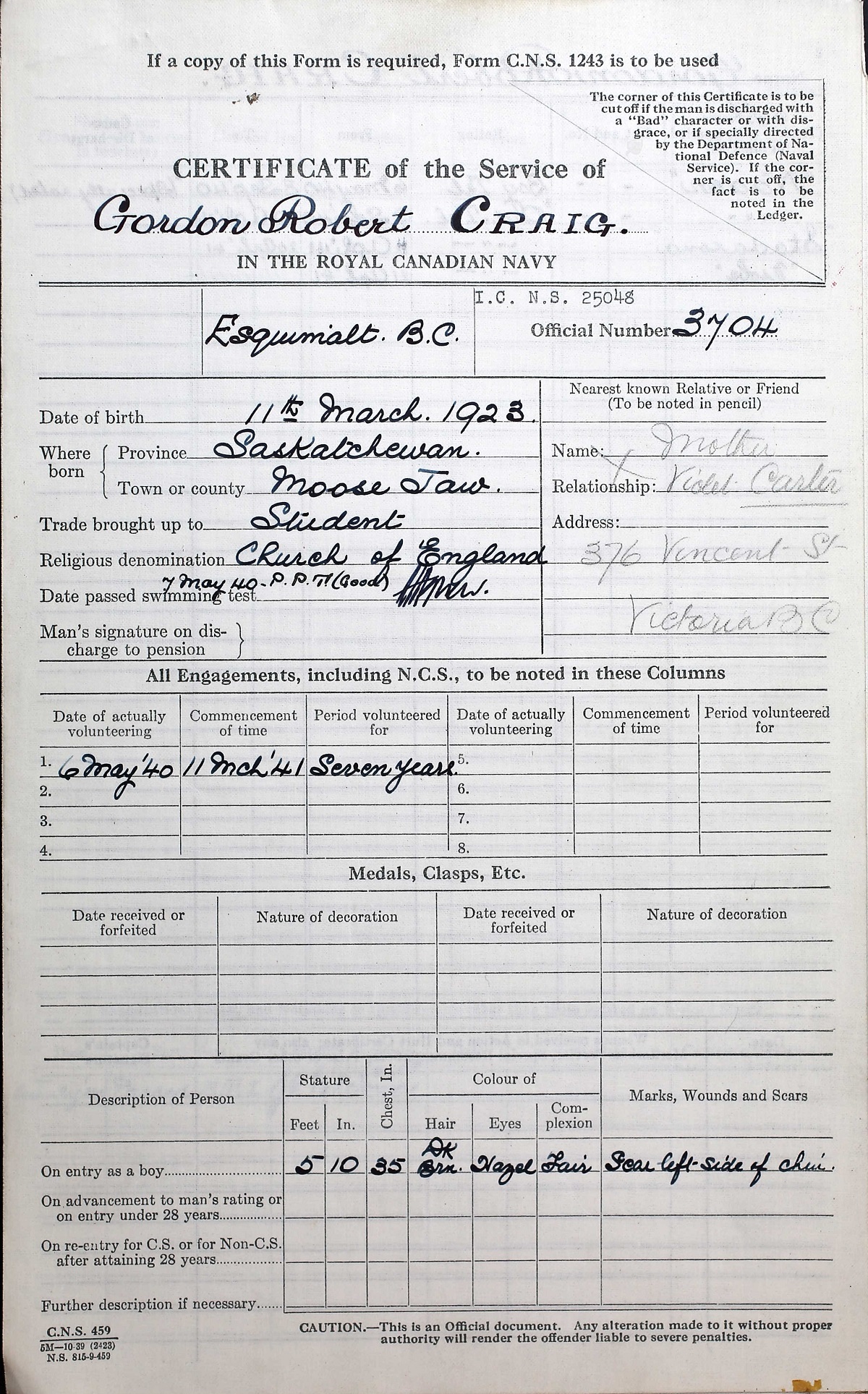 Ordinary Telegraphist Gordon Robert Craig died on the NERISSA which was a chartered troop ship that was torpedoed by U552 off the coast of Ireland on a voyage from Halifax to Liverpool with a loss of 207 lives. He was the son of Violet Craig (remarried as Mrs. Carter). Gordon was born at Moose Jaw, on March 11, 1923. He was educated at the Technical School at Vancouver and Victoria Boys' Central School, and the Central Victoria High School. He was barely 17 when he enlisted into the RCN at Esquimalt British Columbia, on May 06, 1940 as a seaman boy. He was well known locally in sports, winning cups for boxing and certificates in swimming contests. He was unmarried and is survived by his mother, Mrs. Violet Carter, of 567 Walter St., Victoria, British Columbia.