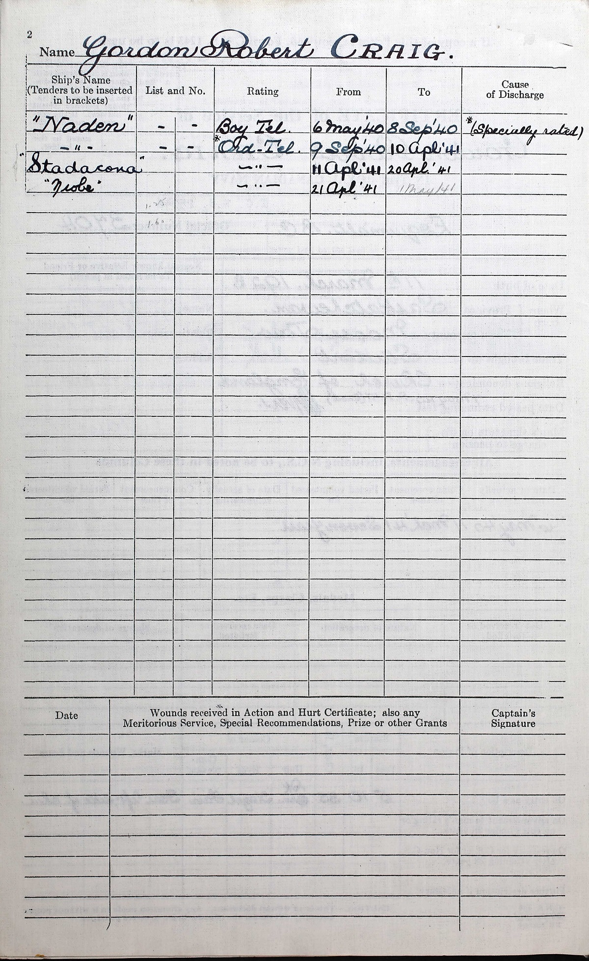 Ships served in: HMCS NADEN (Depot ship for) RCN BARRACKS ESQUIMALT - Enlisted 06 May 1940 as a Boy Tel. Rated Ordinary Tel 09 Sep 1940 HMCS STADACONA (Depot ship) - Drafted to STADACONA 11 Apr 1941as an O/Tel, RCN HMCS NIOBE - Drafted to NIOBE 21 Apr 1941 as a O/Tel, RCN S.S. NERISSA - for passage to NIOBE.