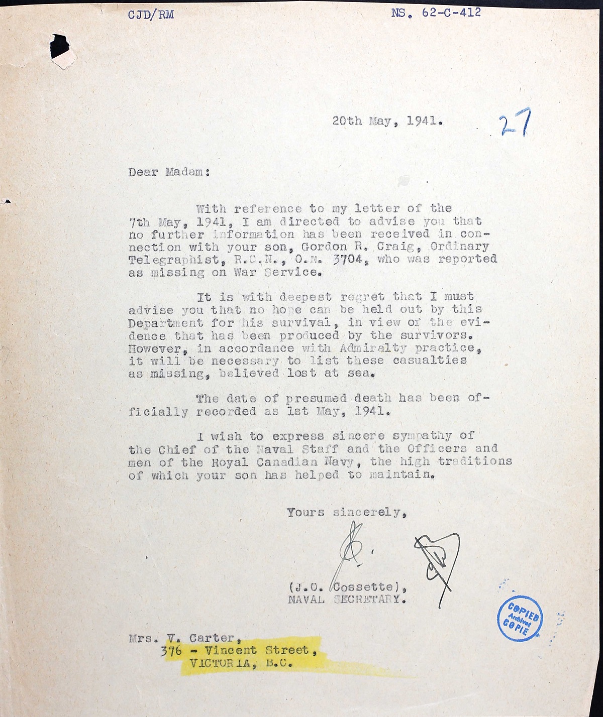 CRAIG, Gordon Robert, O/Tel, 3704, RCN, MPK - 01 May 1941, S.S. NERISSA (Troopship) - Son of Violet Carter Craig, of Victoria, British Columbia.