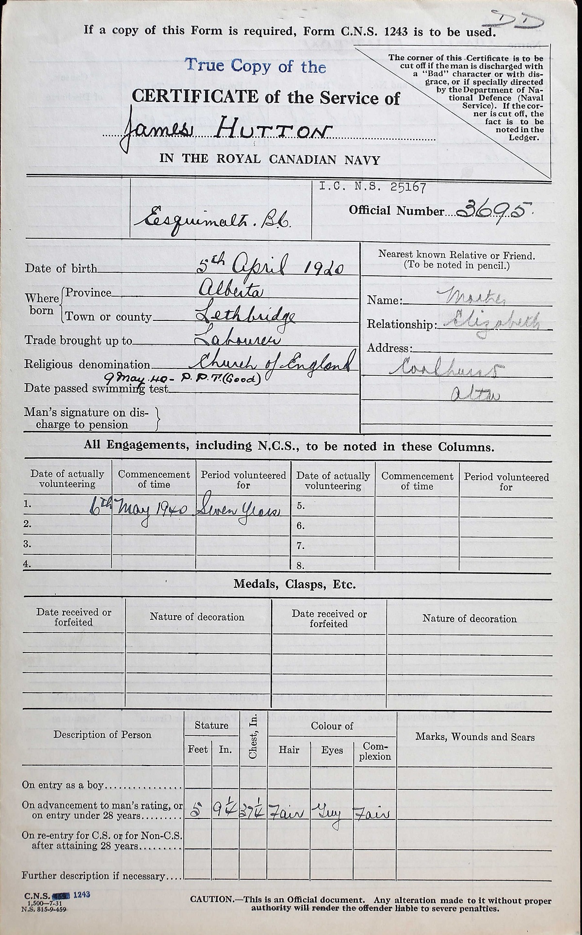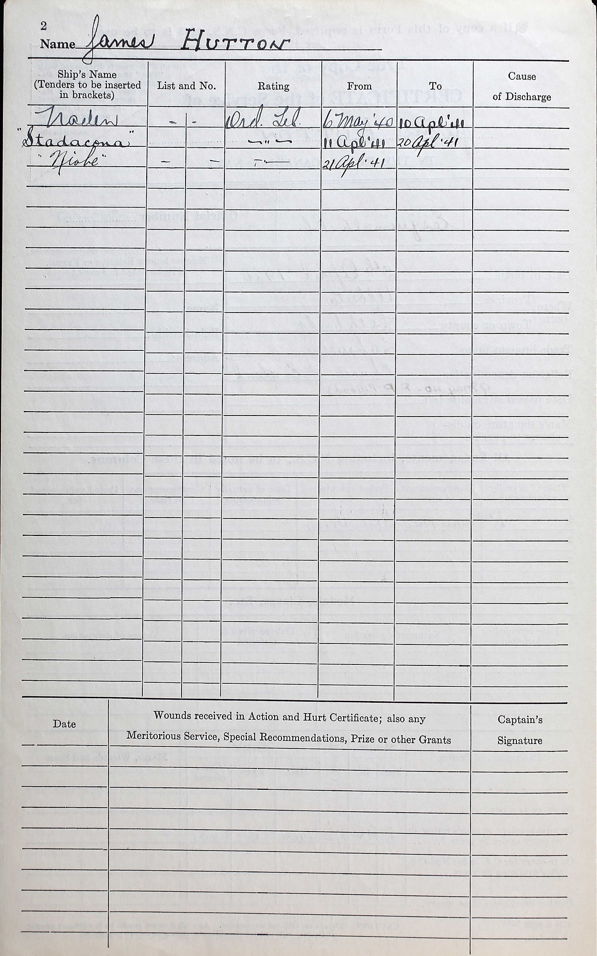 Ships served in: HMCS NADEN (Depot ship for) RCN BARRACKS ESQUIMALT - Enlisted 06 ay 1940 as an O/Tel, RCN HMCS STADACONA (Depot ship) - Drafted to STADACONA 11 Apr 1941 HMCS NIOBE - Drafted to NIOBE 20 Apr 1941 SS NERISSA - For passage to NIOBE