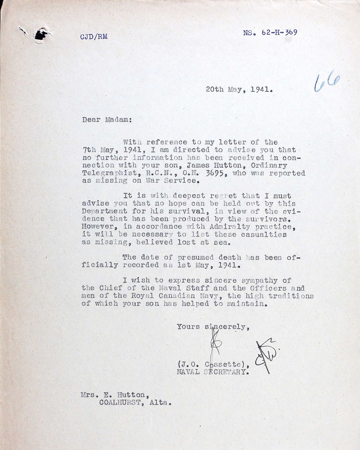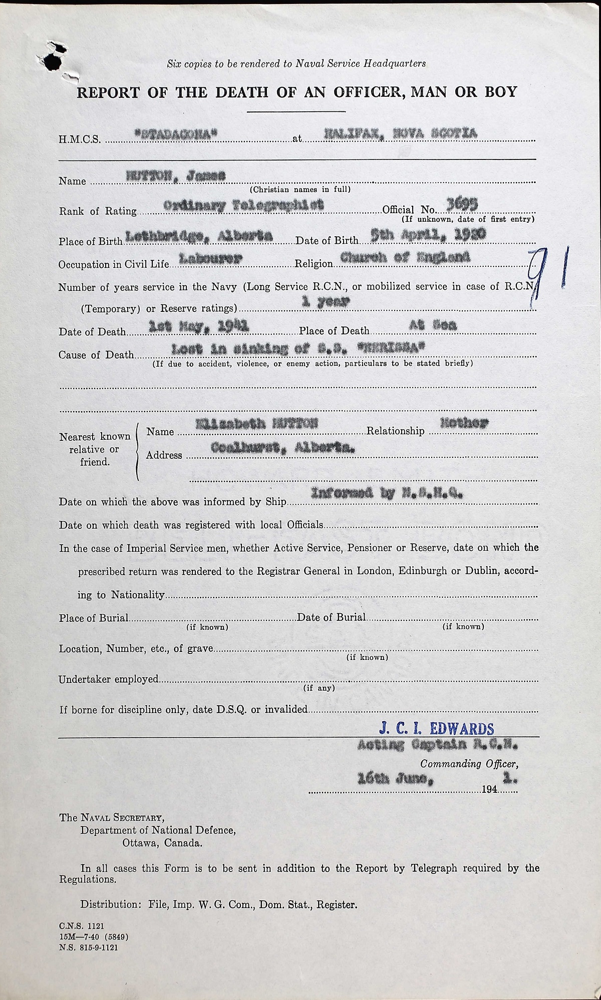 HUTTON, James, Ordinary Telegraphist, 3695, RCN, MPK - 01 May 1941, S.S. NERISSA (Troopship) - Son of Elizabeth Hutton, of Coalhurst, Alberta.