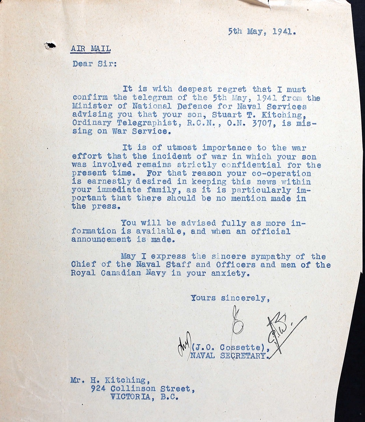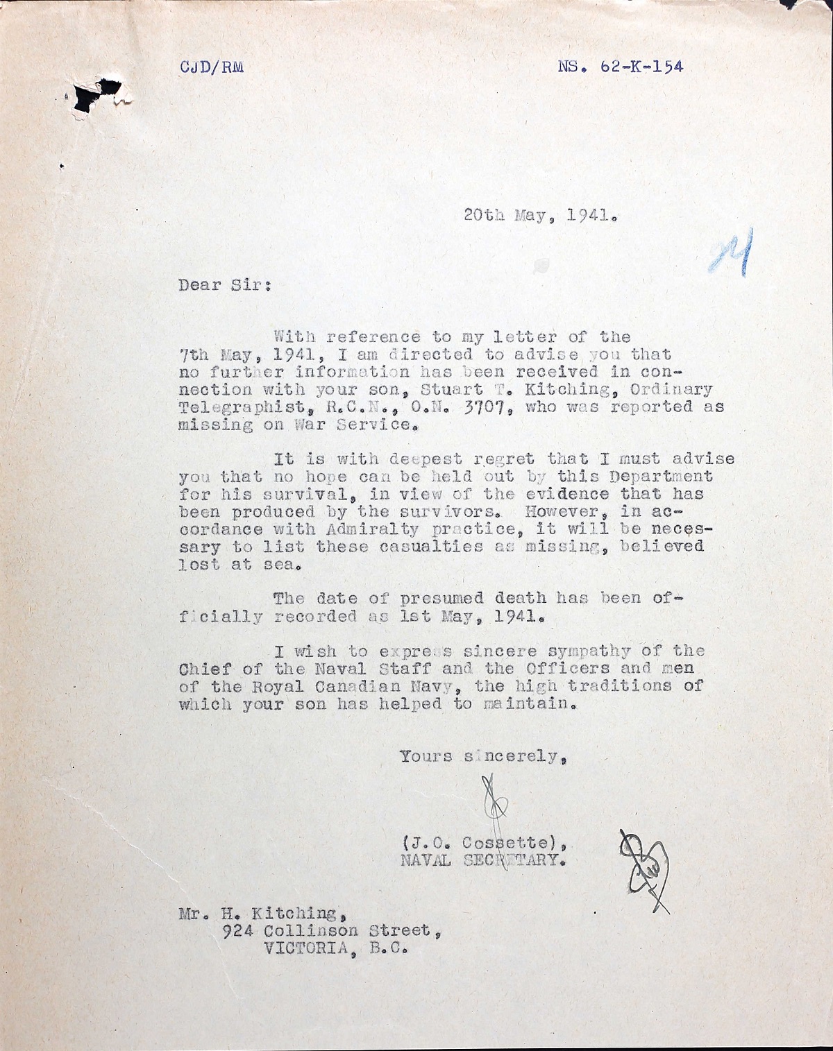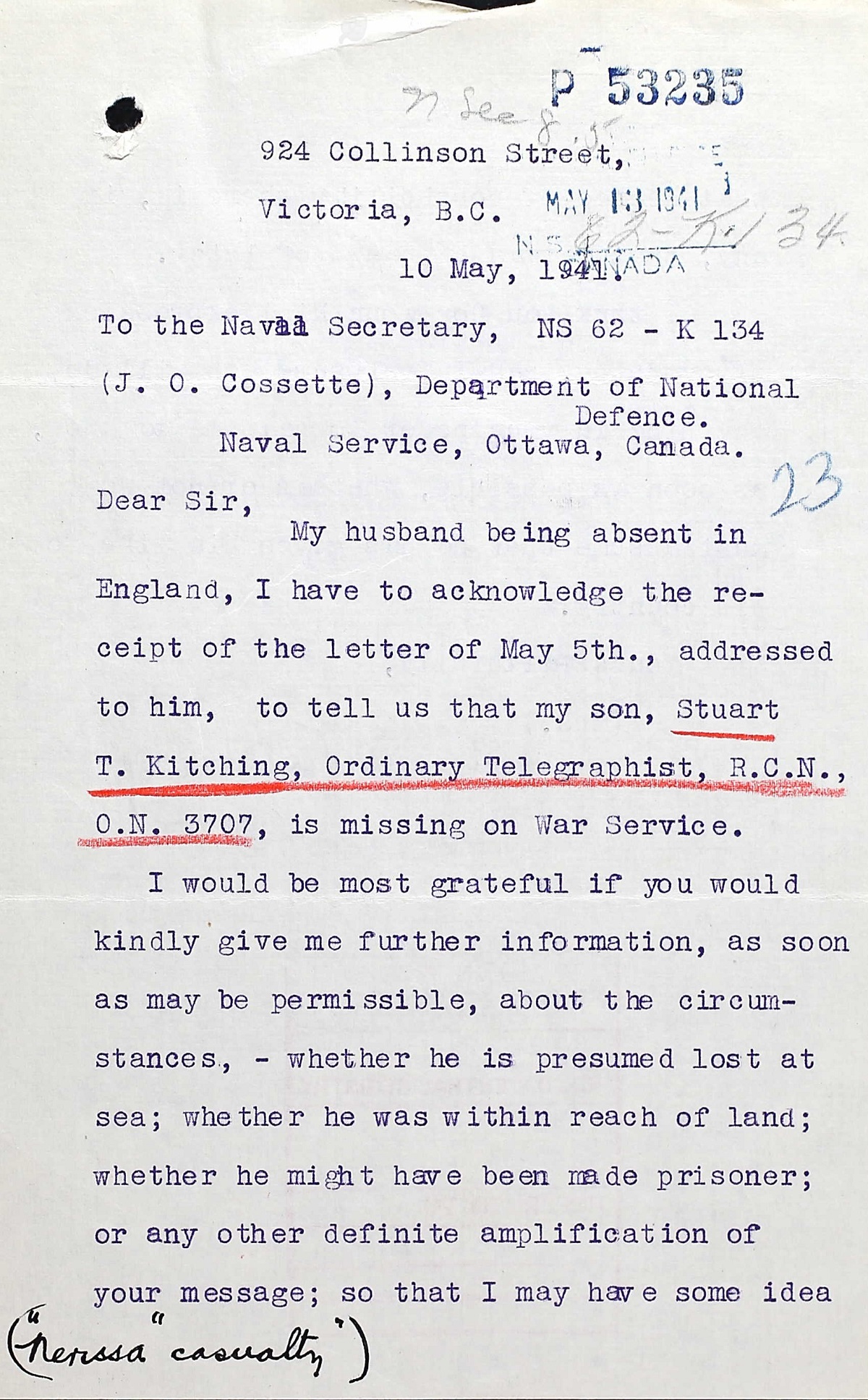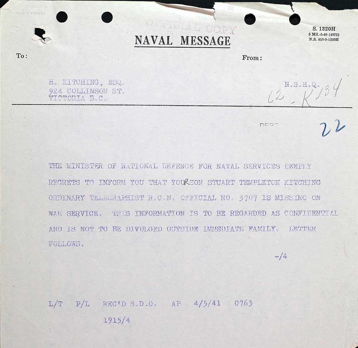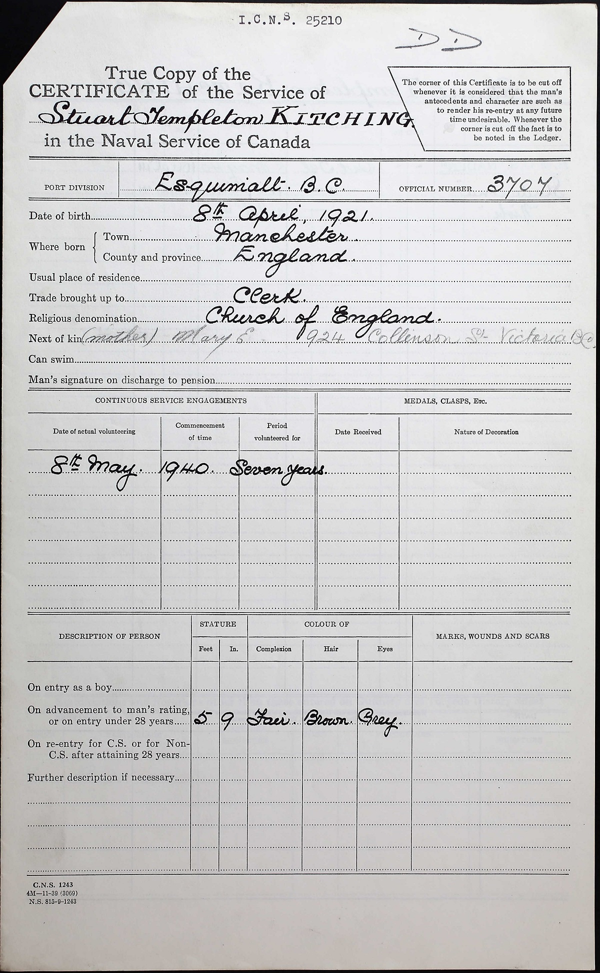 KITCHING, Stuart Templeton, O/Tel, 3707, RCN, MPK - 01 May 1941, S.S. NERISSA (Troopship) - Son of Harold and Mary Ethel Kitching, of Victoria, British Columbia.