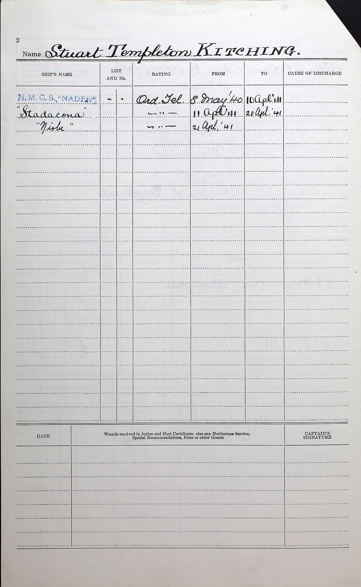 Ships served in: HMCS NADEN (Depot ship for) RCN BARRACKS ESQUIMALT - Enlisted 08 May 1940 as an O/Tel, RCN HMCS STADACONA (Depot ship) - Drafted to STADACONA 11 Apr 1941 HMCS NIOBE - Drafted to NIOBE 20 Apr 1941 S.S. NERISSA - for passage to NIOBE
