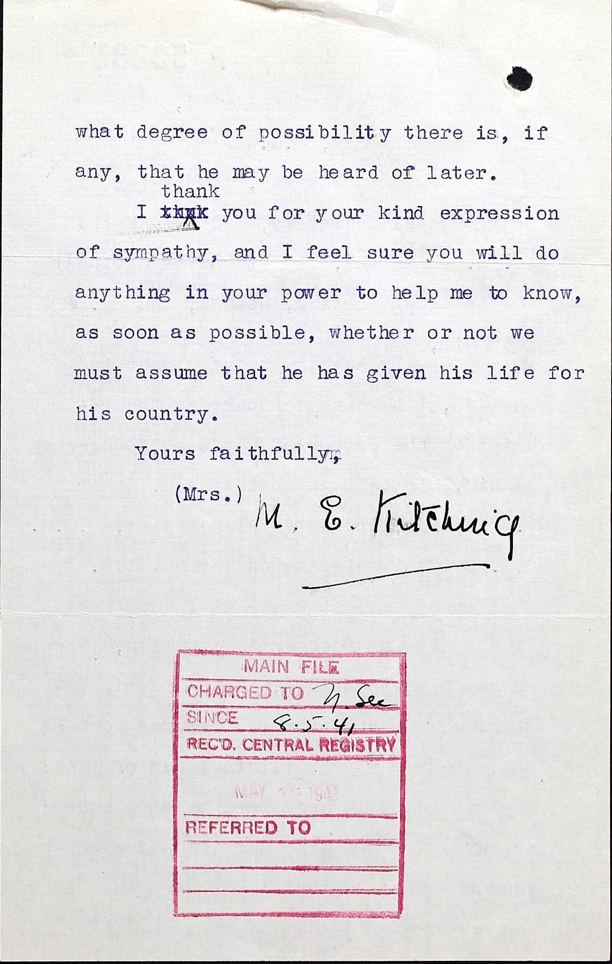 (SK04) Letter to O/Tel Kitching's father (SK05-SK06) Letter to the Naval Secretary from O/Tel Kitching's mother (SK07) Letter to O/Tel Kitching's father
