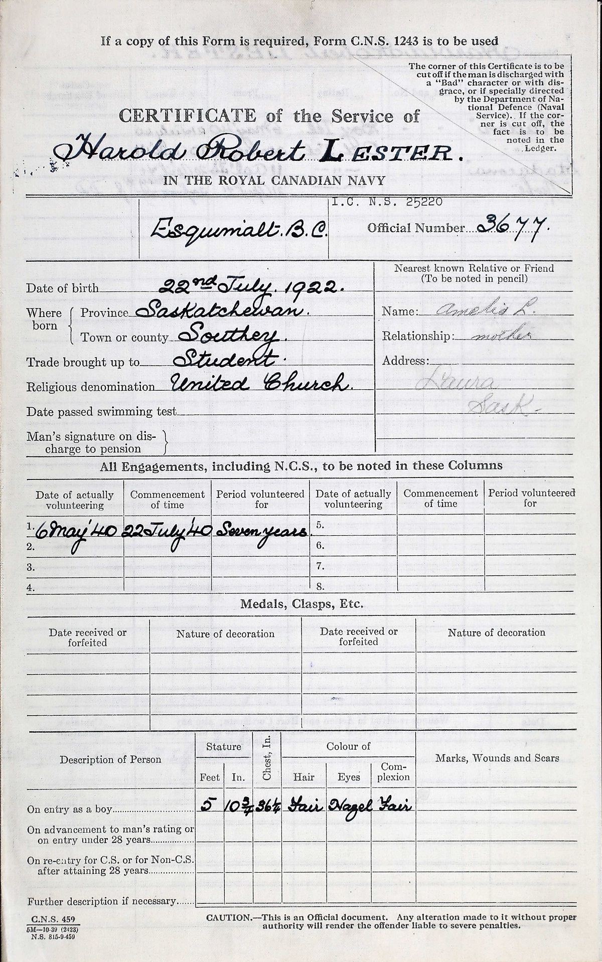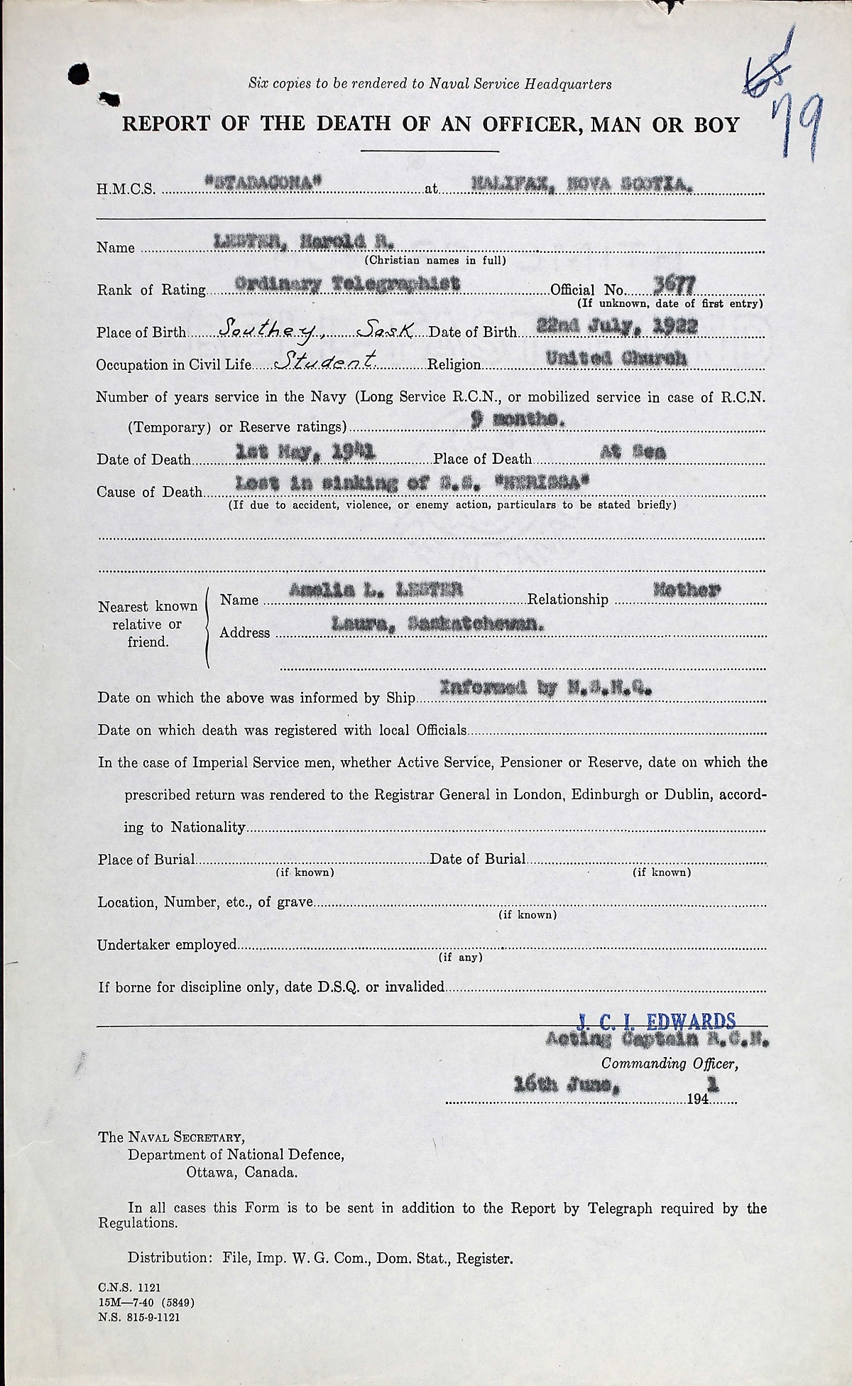 Ordinary Telegraphist Harold Robert Lester was one of the casualties in the sinking of S.S. NERISSA. He was the son of Robert W. and Amelia L. Lester who homesteaded east of Evesham, Saskatchewan, later moving to a farm at Laura. Harold was born at Southey, Saskatchewan and was a student when he enlisted on May 06, 1940 at Esquimalt, British Columbia almost a year to the day before his death.