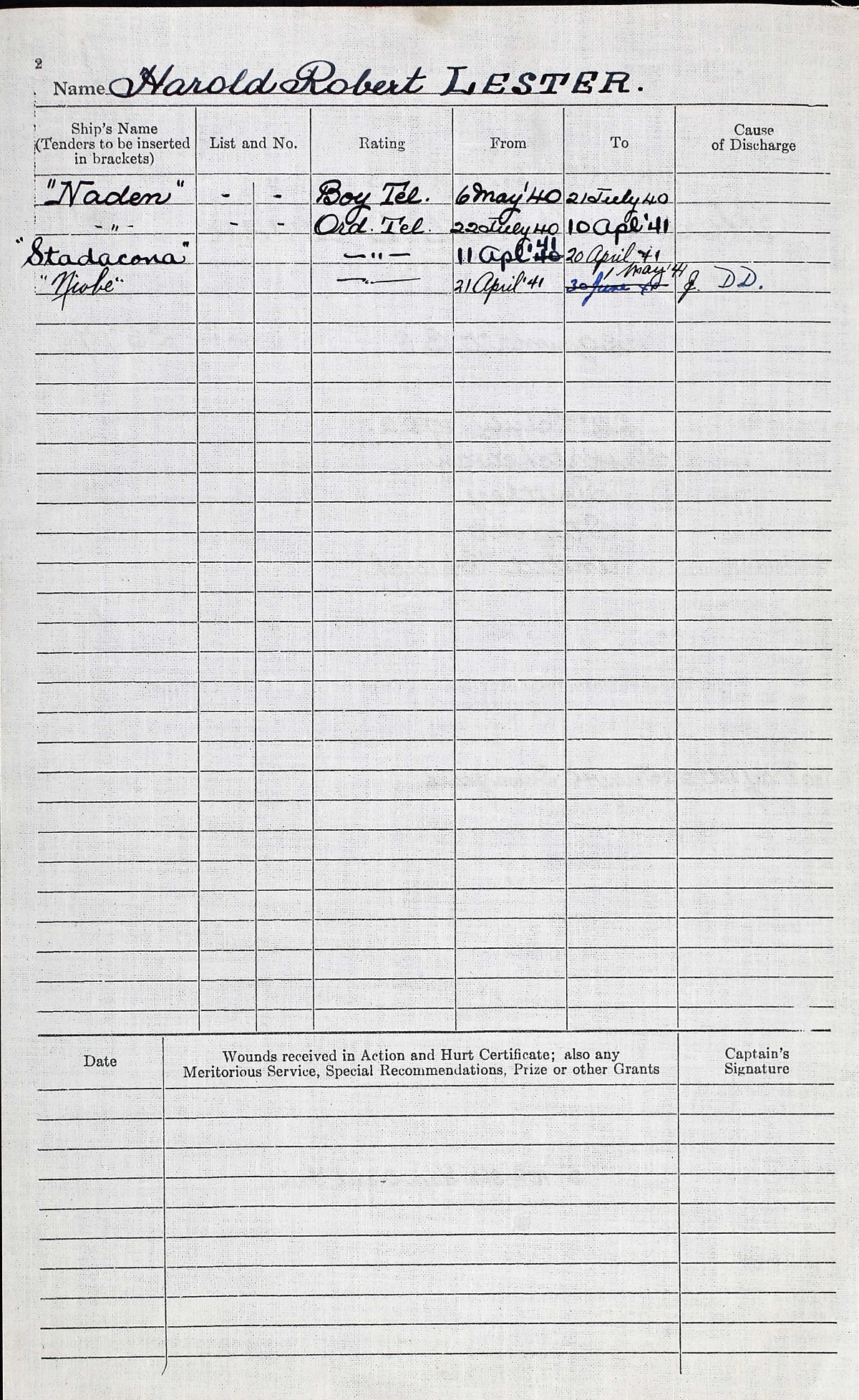 Ships served in: HMCS NADEN (Depot ship for) RCN BARRACKS ESQUIMALT - Enlisted 06 May 1940 as a Boy Tel, RCN. Rated O/Tel 22 Jul 1940 HMCS STADACONA (Depot ship) - Drafted to STADACONA 11 Apr 1941 as an O/Tel, RCN HMCS NIOBE - Drafted to NIOBE 20 Apr 1941 as an O/Tel, RCN S.S. NERISSA - for passage to NIOBE