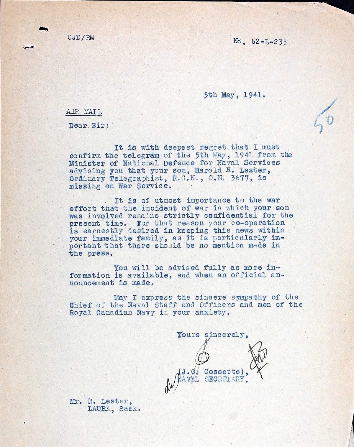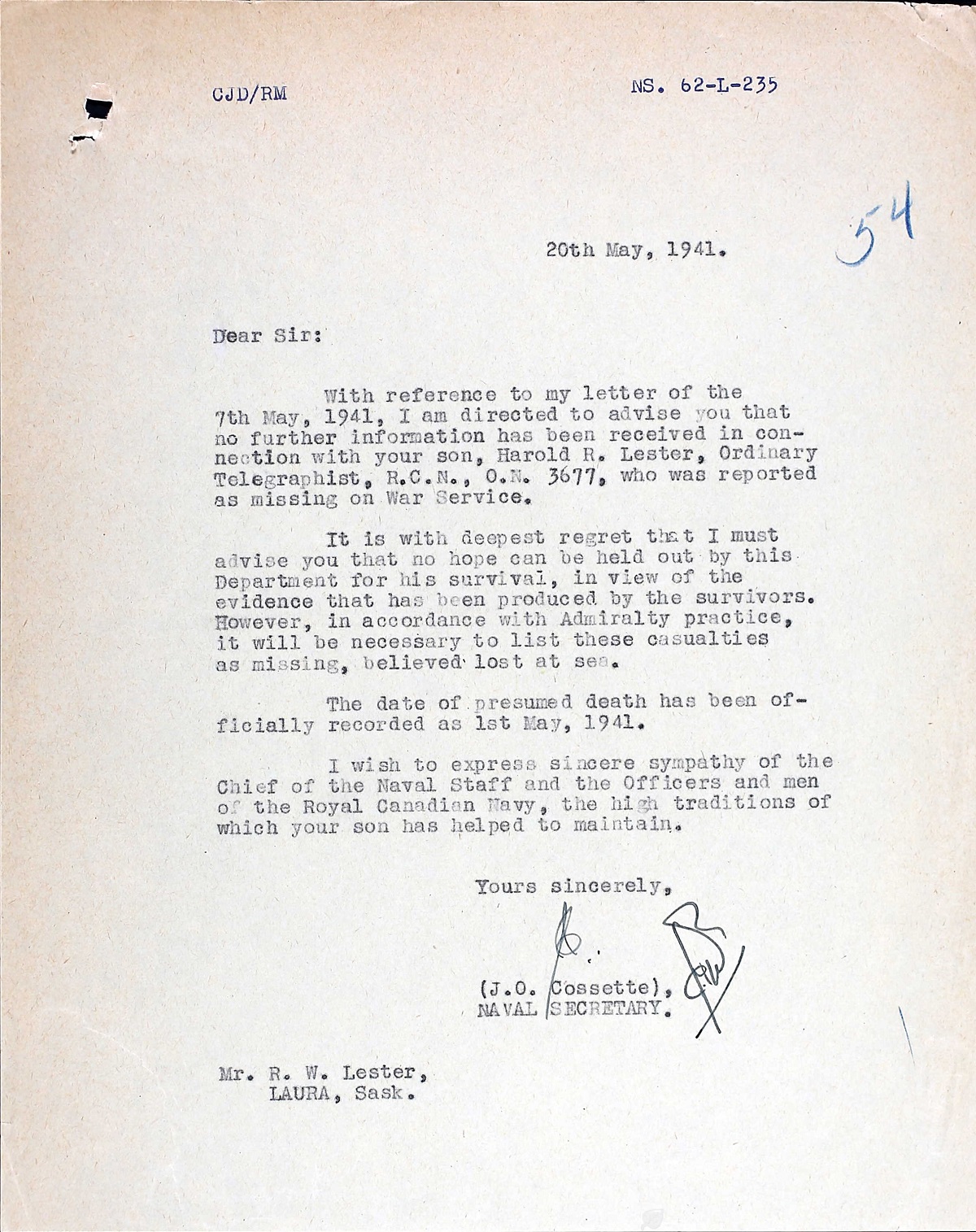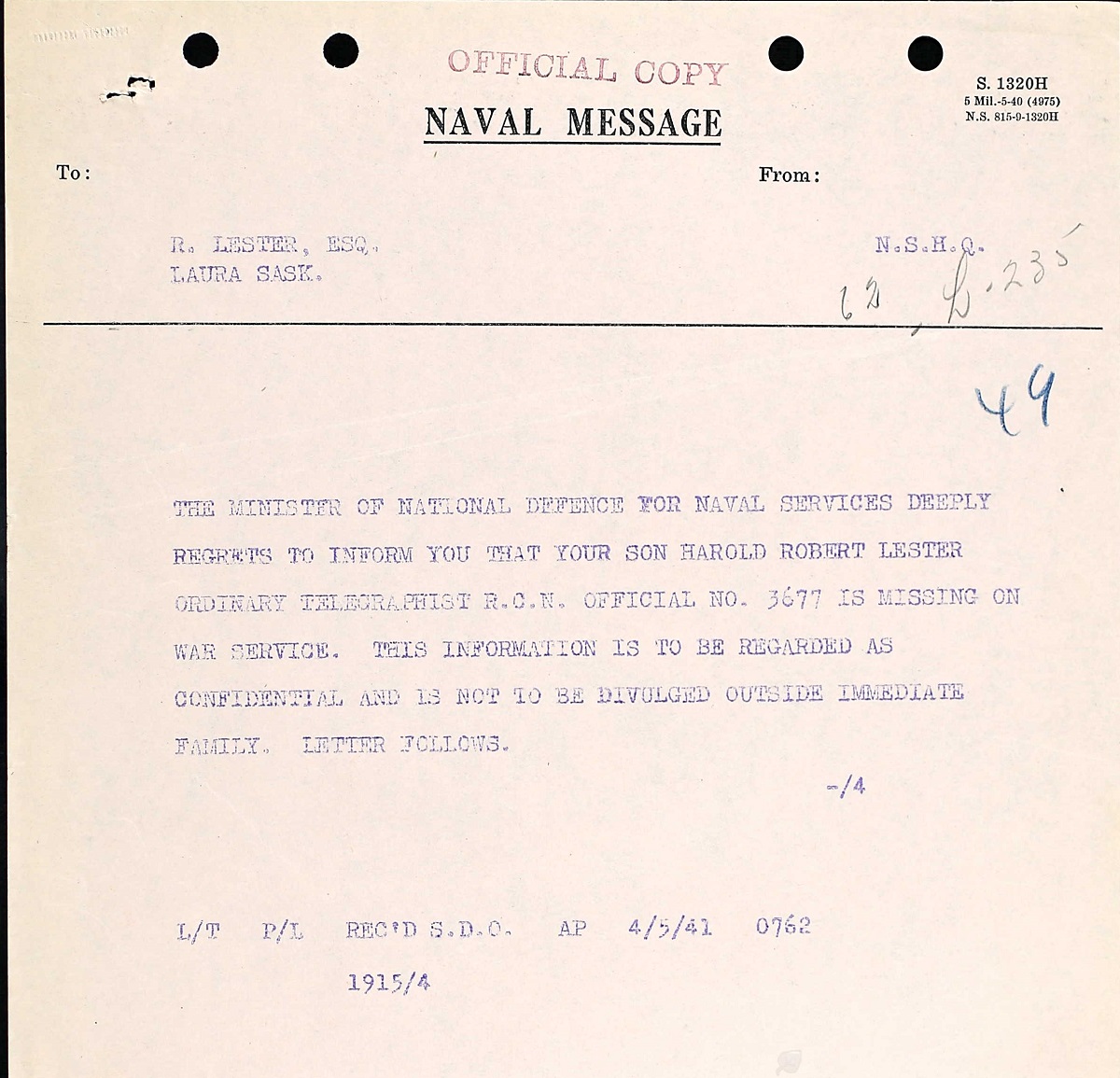 LESTER, Harold Robert, O/Tel, 3677, RCN, MPK - 01 May 1941, S.S. NERISSA (Troopship) - Son of Robert W. and Amelia L. Lester, of Laura, Saskatchewan.