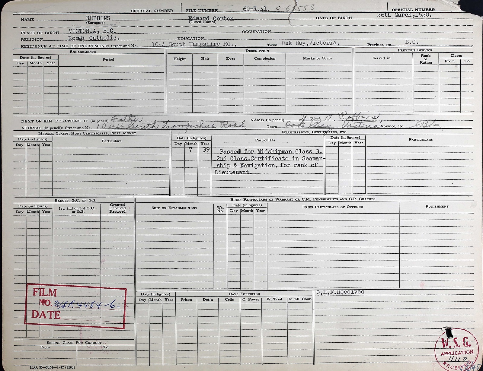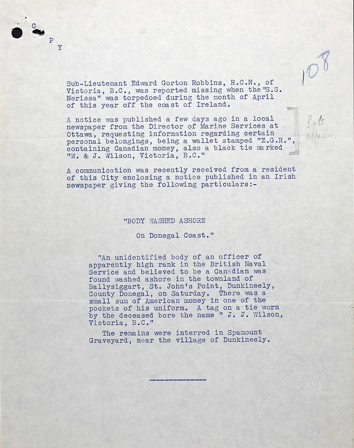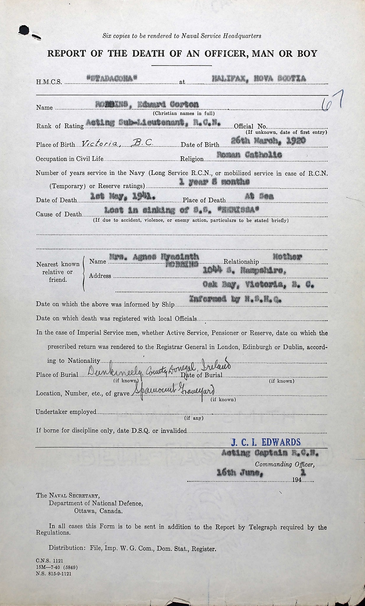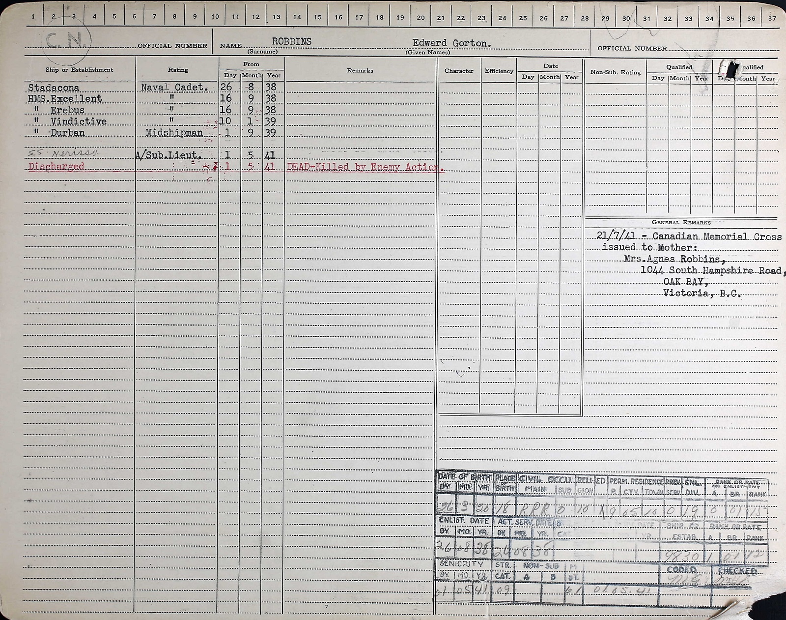ROBBINS, Edward Gorton, SLt, O-62553, RCN, Killed - 30 Apr 1941, S.S. NERISSA - Son of William Alan and Agnes Hyacinthe Robbins, of Oak Bay, Victoria, British Columbia, Canada.
