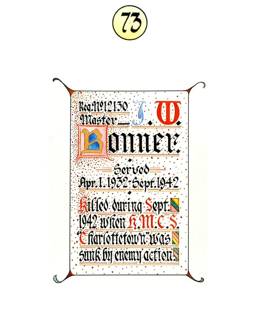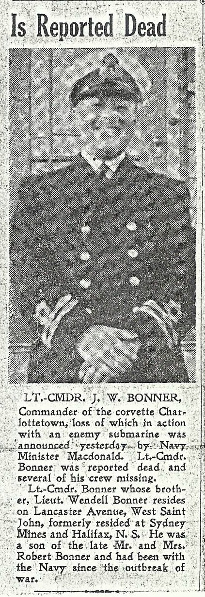 BONNER, John Willard, LCdr, RCNR, MPK - 11 Sep 1942, HMCS CHARLOTTETOWN - Son of the late Robert and Ellen Bonner. Brother of Wendall, Thomas, May and Eleanor. Husband of Mary Bonner and father of Moira Marilyn of Halifax, Nova Scotia.