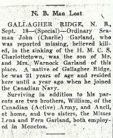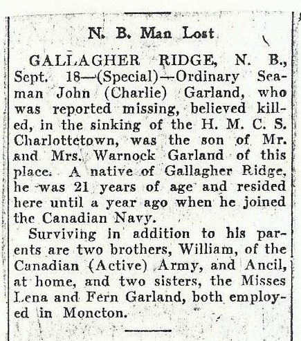 GARLAND, John Charlie, OS, V/2703, RCNVR, MPK - 11 Sep 1942, HMCS CHARLOTTETOWN - Son of Warnick C. and Annie K. Garland, of Gallagher Ridge, New Brunswick.