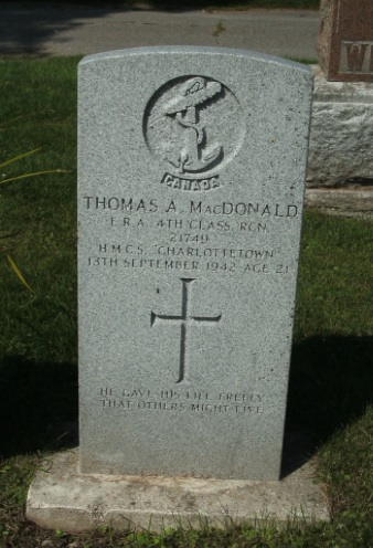 Engine Room 4th Class T. A. Macdonald died at sea of his wounds on September 13, 1942 which he sustained in enemy action when HMCS Charlottetown was sunk on September 11, 1942. ERA MacDonald was buried in the Protestant Cemetery, Gaspe, Quebec. At the request of his mother, he was later exhumed and reburied in the Little Lake Cemetery, Peterborough, ON.