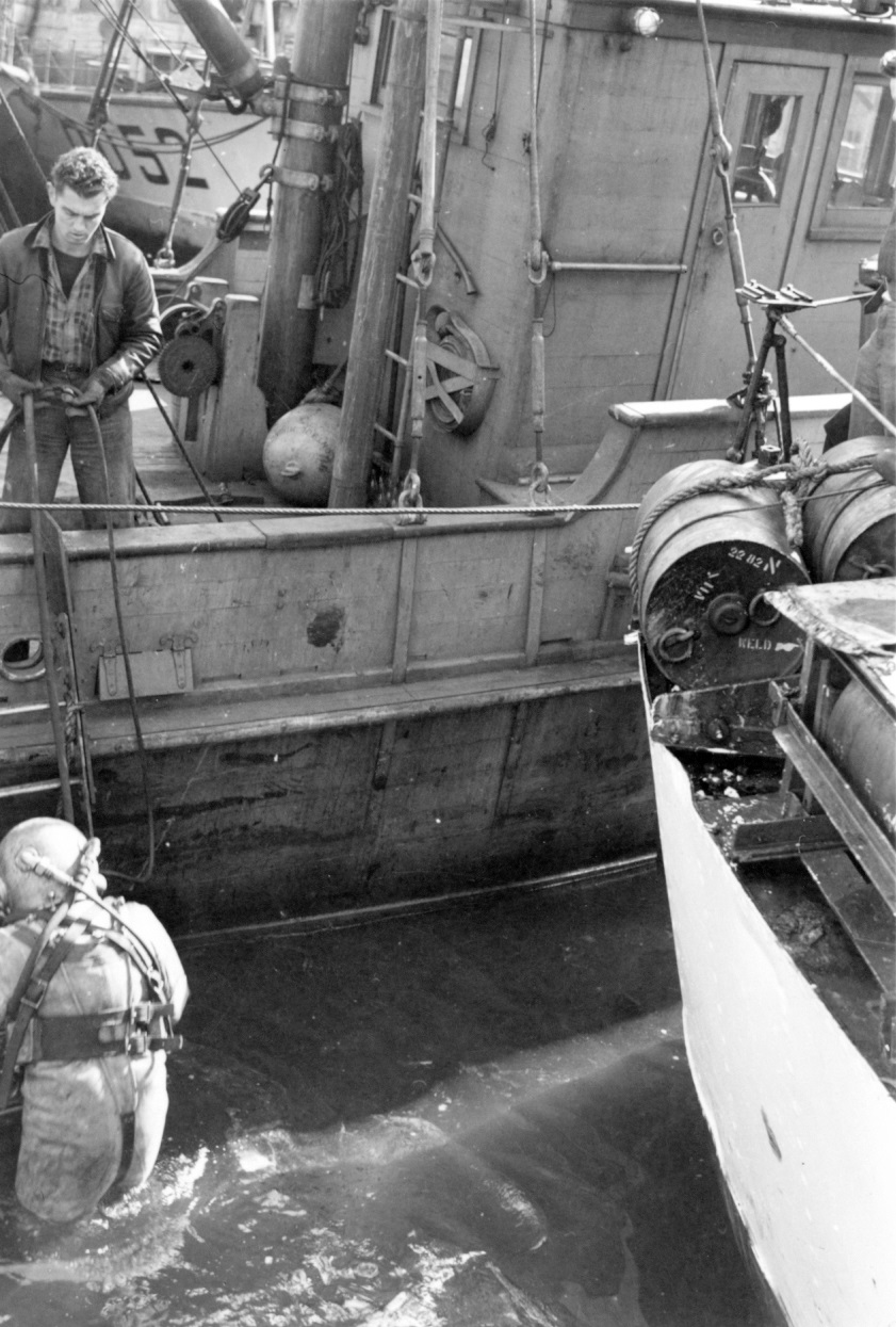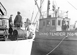 (CA29) Diving Tender No. 4 in Halifax. Unknown Minesweeper on the left side of photo (CA30) Diver going into the water from Diving Tender # 4, Halifax (CA31) USN landing craft in the approaches to Halifax harbour