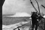 (CA158-CA159) HMCS FREDERICTON K245 in heavy seas in the North Atlantic (CA160) HMCS FREDERICTON K245 preparing to launch the ship's boat. Unknown coastline in the background (CA161) Unknown sailor on the after end of the boat deck on HMCS FREDERICTON K245 (CA162) Unknown sailor on HMCS FREDERICTON K245