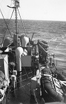 (CA163-164) HMCS FREDERICTON K245 receiving depth charges from a merchant ship by jackstay (CA165) Unknown sailor on look-out by an Oerlikon on HMCS FREDERICTON K245 (CA166) Unknown sailors on the bridge wing of HMCS FREDERICTON K245